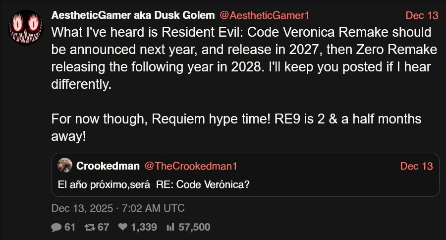 Обсуждение началось после того, как фанат серии спросил инсайдера, может ли Capcom представить ремейк Code: Veronica на предстоящем Xbox-событии в конце января. DuskGolem ответил, что компания точно не будет анонсировать новые игры серии всего за месяц до премьеры Resident Evil Requiem, чтобы не отвлекать внимание от этого тайтла. Однако он подтвердил, что анонс состоится позже в течение года.