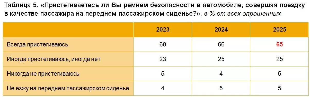 Мониторинг распространенности практики использования ремней безопасности пассажирами автомобиля показал, что кратковременный всплеск внимания к безопасности едущих на задних сиденьях пассажиров в 2024 году не привел к устойчивым позитивным изменениям. Это подтверждает необходимость более системной и долгосрочной коммуникации со стороны государства и автоинспекторов.