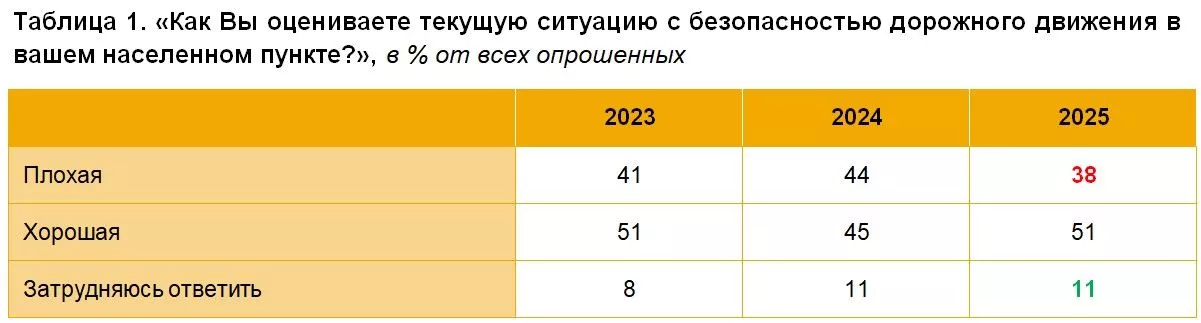 Каждый второй россиянин (51%) считает ситуацию с безопасностью дорожного движения в своем населенном пункте хорошей. За последние три года доля негативных оценок сократилась с 41% до 38%.