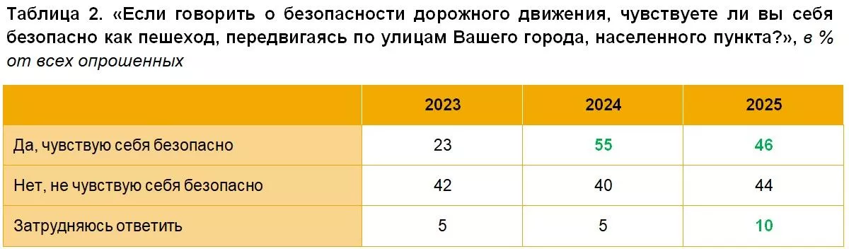 За последний год доля россиян, которые считают ситуацию с дорожной безопасностью в своем населенном пункте хорошей, увеличилась на 6 п.п. (с 45% в 2024 году до 51% в 2025 году) и вернулась на уровень 2023 года. При этом значительное число граждан регулярно сталкиваются с опасным поведением участников дорожного движения: две трети (67%) часто или время от времени наблюдали проезда автомобилей на красный сигнал светофора. Доля тех, кто всегда пристегивается на заднем сиденье, после роста в 2024 году до 51%, снизилась до 45%.
