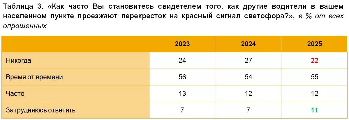 В 2025 году менее четверти россиян (22%) сообщили, что никогда не видели случаев проезда автомобиля на красный сигнал светофора — минимальное значение за три года.