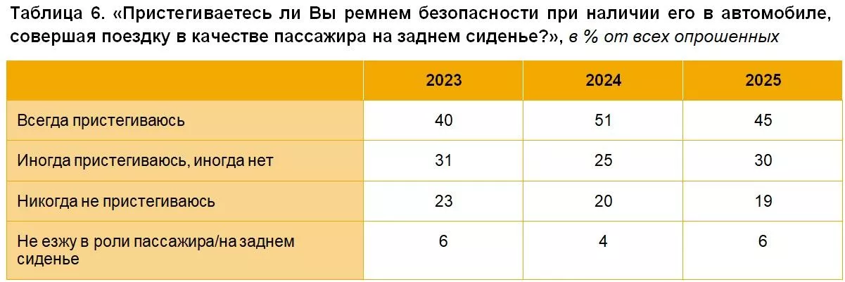Заметной проблемой продолжает оставаться низкая дисциплина использования ремней безопасности пассажирами, особенно на заднем сиденье.