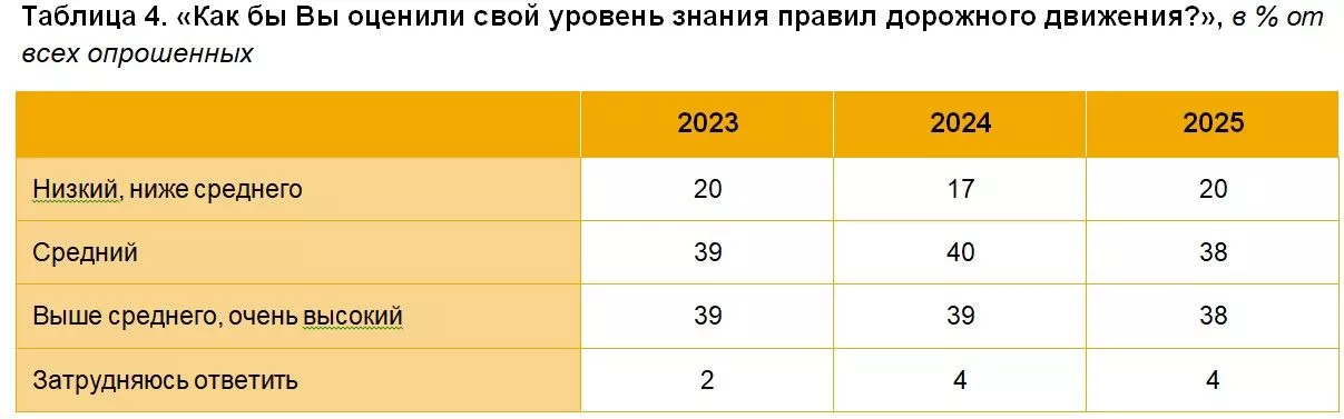 Россиянам не хватает знаний правил дорожного движения — менее 40% считают, что обладают такими знаниями на высоком уровне или выше среднего. Больше половины (58%) оценивают их как средние или ниже среднего.