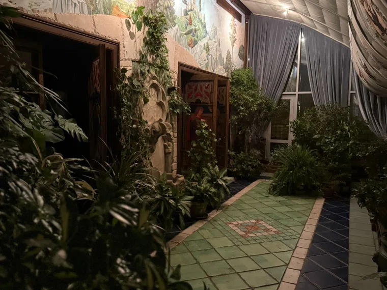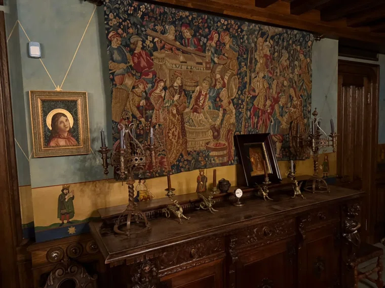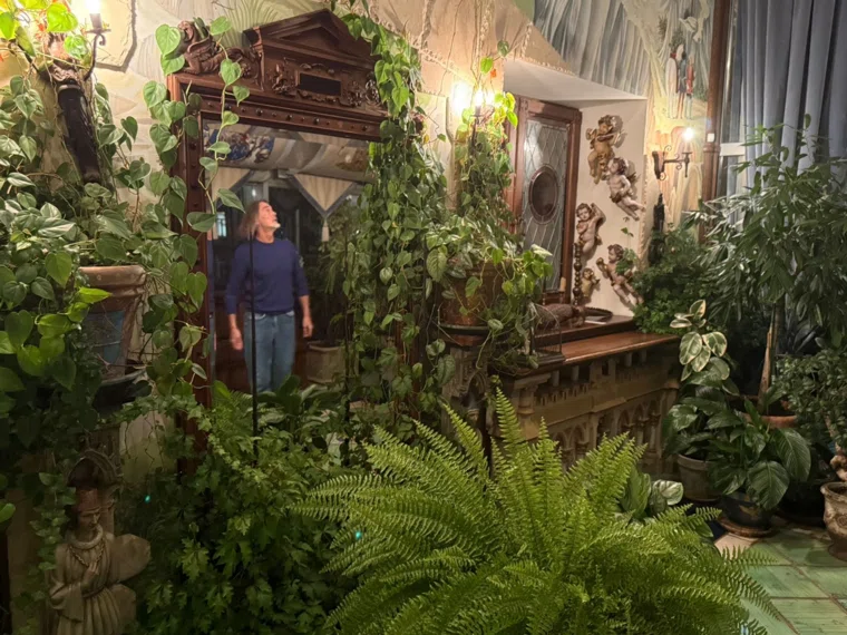 Зимний сад отделяют от квартиры совершенно уникальные двери с оригинальными витражами — на них сам художник и его бывшая девушка в средневековых одеждах. Стены здесь тоже расписаны: в лицах узнается и сам Никас Сафронов, и его друзья.