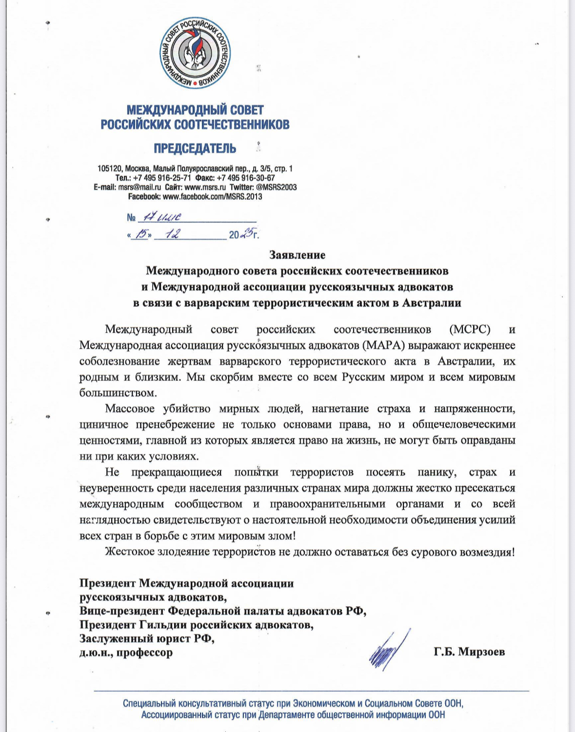 Международная ассоциация русскоязычных адвокатов (МАРА) и Международный совет российских соотечественников (МСРС) приняли совместное Заявление в связи с варварским террористическим актом в Австралии.