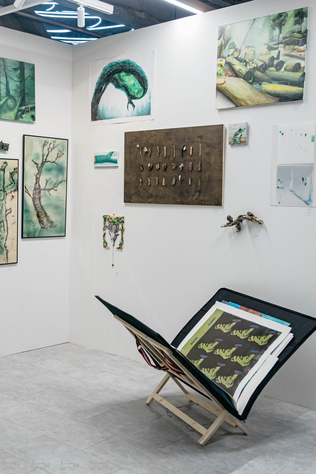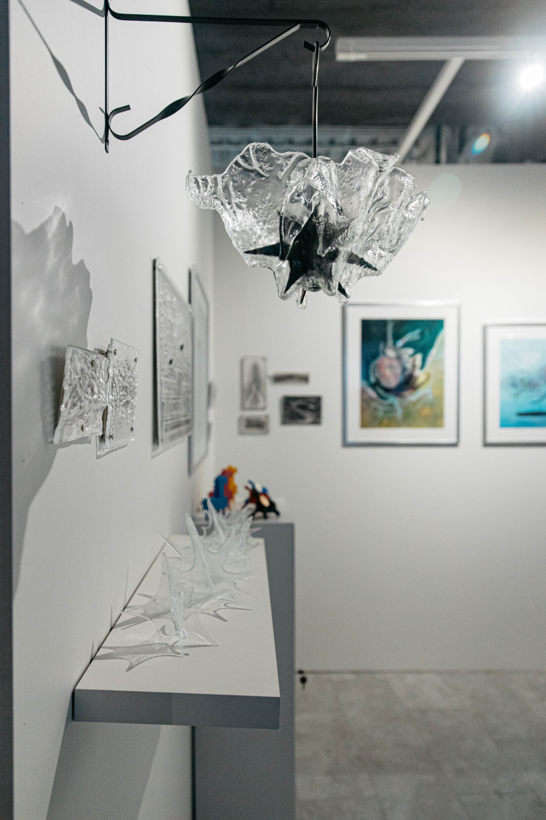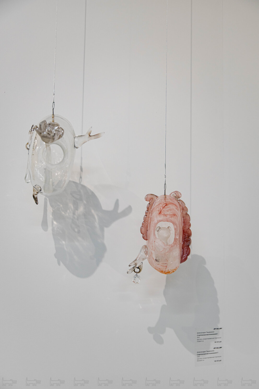MYTH Gallery подсветила камерные форматы. Стенд объединил живопись, графику тушью и акварелью, гербарные сканограммы, «игрушки» в технике pâte de verre и ювелирные шипы Кати Исаевой, Петра Кирюши, Ульяны Подкорытовой и Милены Стрелковой.