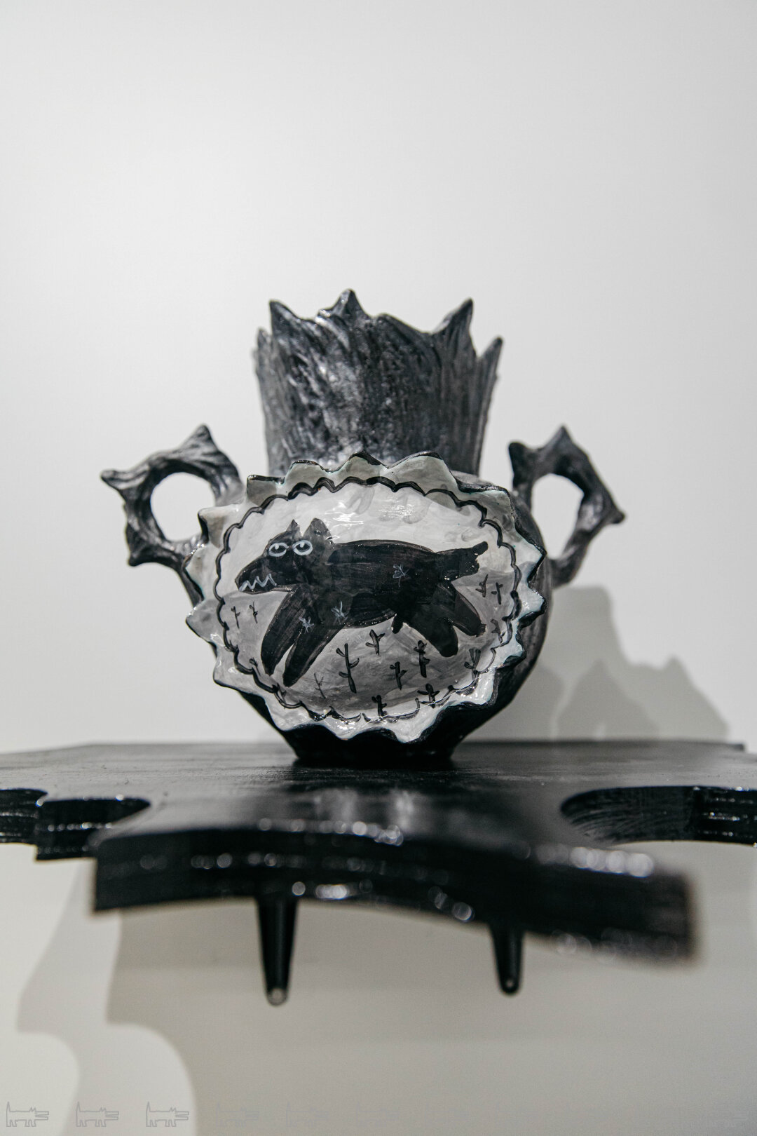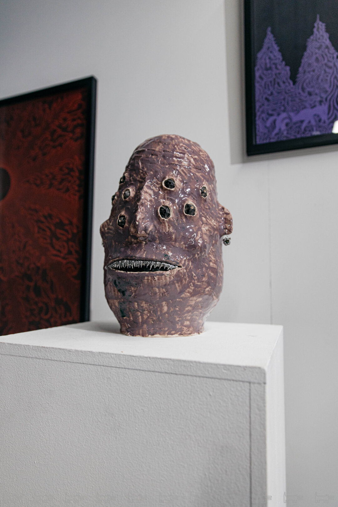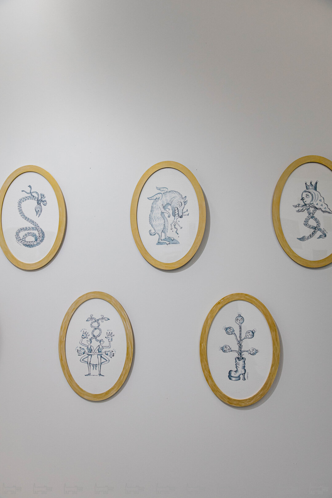 MYTH Gallery подсветила камерные форматы. Стенд объединил живопись, графику тушью и акварелью, гербарные сканограммы, «игрушки» в технике pâte de verre и ювелирные шипы Кати Исаевой, Петра Кирюши, Ульяны Подкорытовой и Милены Стрелковой.