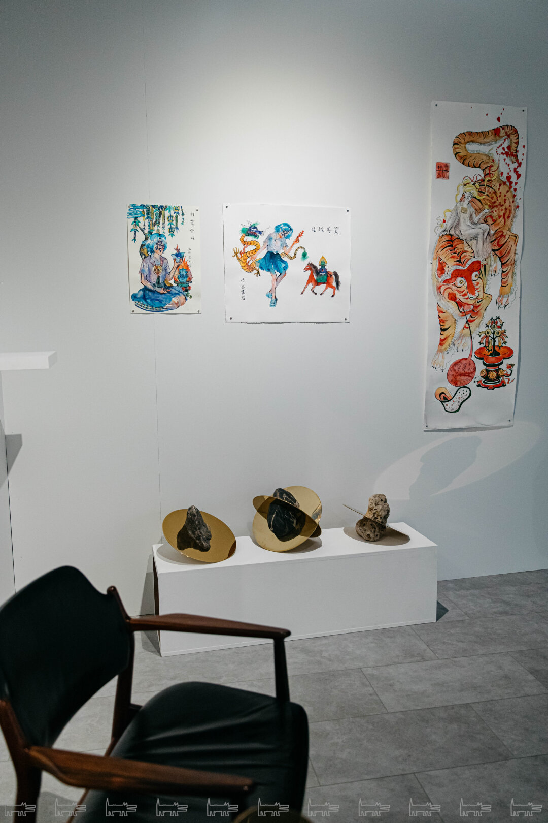 Работы дополнили объекты из камня и бронзы Дениса Патракеева. Его подход строится на диалоге с природным материалом — художник не стремится полностью подчинить его, а позволяет «высказаться», раскрыть внутреннюю сущность. В результате, природная форма переводится в область художественного жеста, а сам материал обретает сакральное звучание. Сильным визуальным противопоставлением скульптурным объектам стали яркие сюрреалистические полноформаты Марьи Дмитриевой.