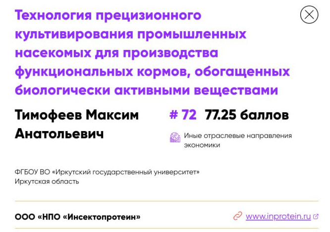 В Иркутском госунивеситете несколько лет развивается стартап в по производству кормовых продуктов из насекомых под брендом «Инпротеин». Проект реализуется в рамках «Всероссийского рейтинга ТОП 1000 стартапов». Рейтинг является составляющей частью федеральной «Платформы университетского технологического предпринимательства», которая ежегодно отбирает и ранжирует самые перспективные студенческие и университетские стартапы.