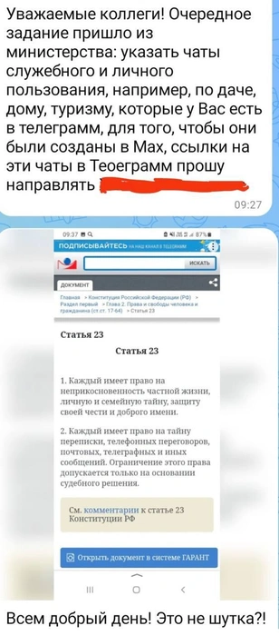 «Уважаемые коллеги! Очередное задание пришло из министерства: указать чаты служебного и личного пользования, например, по даче, дому, туризму, которые у вас есть в телеграмм, для того чтобы они были созданы в Max», — гласит сообщение, которое публикует Аксютенко.