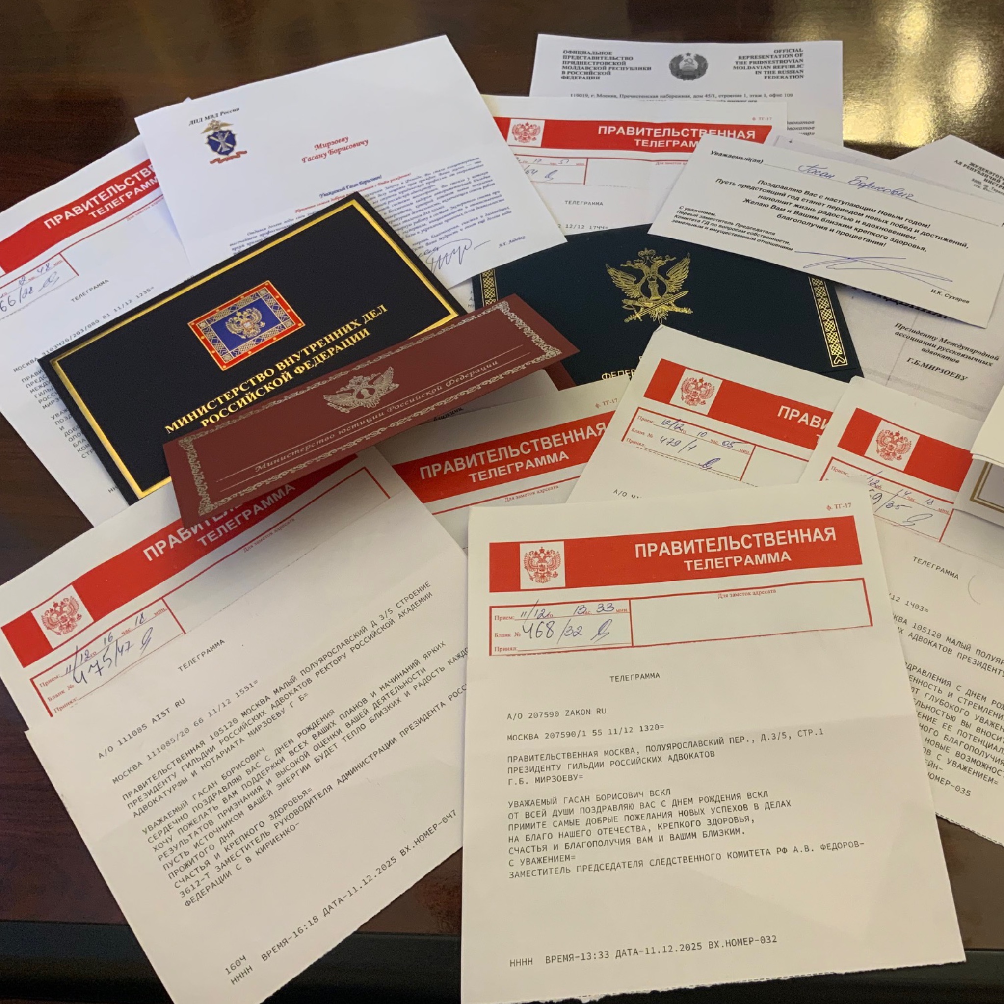 На имя Президента Международной ассоциации русскоязычных адвокатов, вице- президента ФПА РФ, Президента Гильдии российских адвокатов, председателяМеждународного совета российских соотечественников, ректора Российского университета адвокатуры и нотариата, председателя президиума КА «Московский юридический центр», Почётного адвоката России, Заслуженного юриста РФ, профессора Гасана Борисовича Мирзоева поступили многочисленные поздравления с 78– летием: