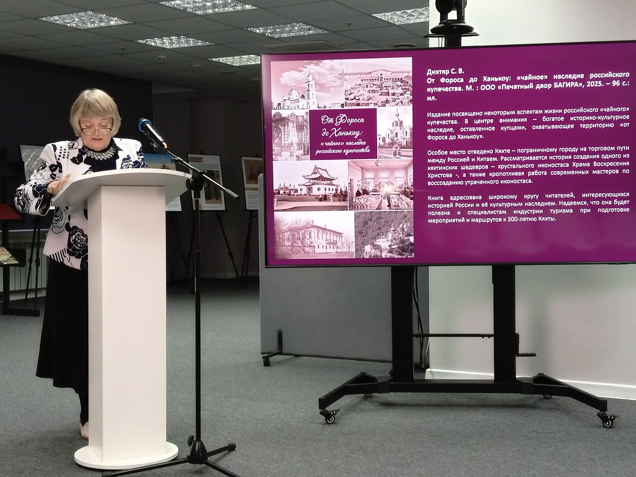 Презентацию книги «От Фороса до Ханькоу: «чайное» наследие российского купечества» Светланы Дихтяр представила Петрова Анна Николаевна, независимый исследователь, куратор проекта «Хрустальное чудо Кяхты» (г. Кяхта). Она рассказала о Воскресенской церкви на границе с Монголией, в которой проходили молебны в начале экспедиций исследователей в Центральную Азию, там крестились, венчались и отпевались прихожане, в том числе именитые кяхтинские миллионеры. Рассказала историю создания хрустального иконостаса.