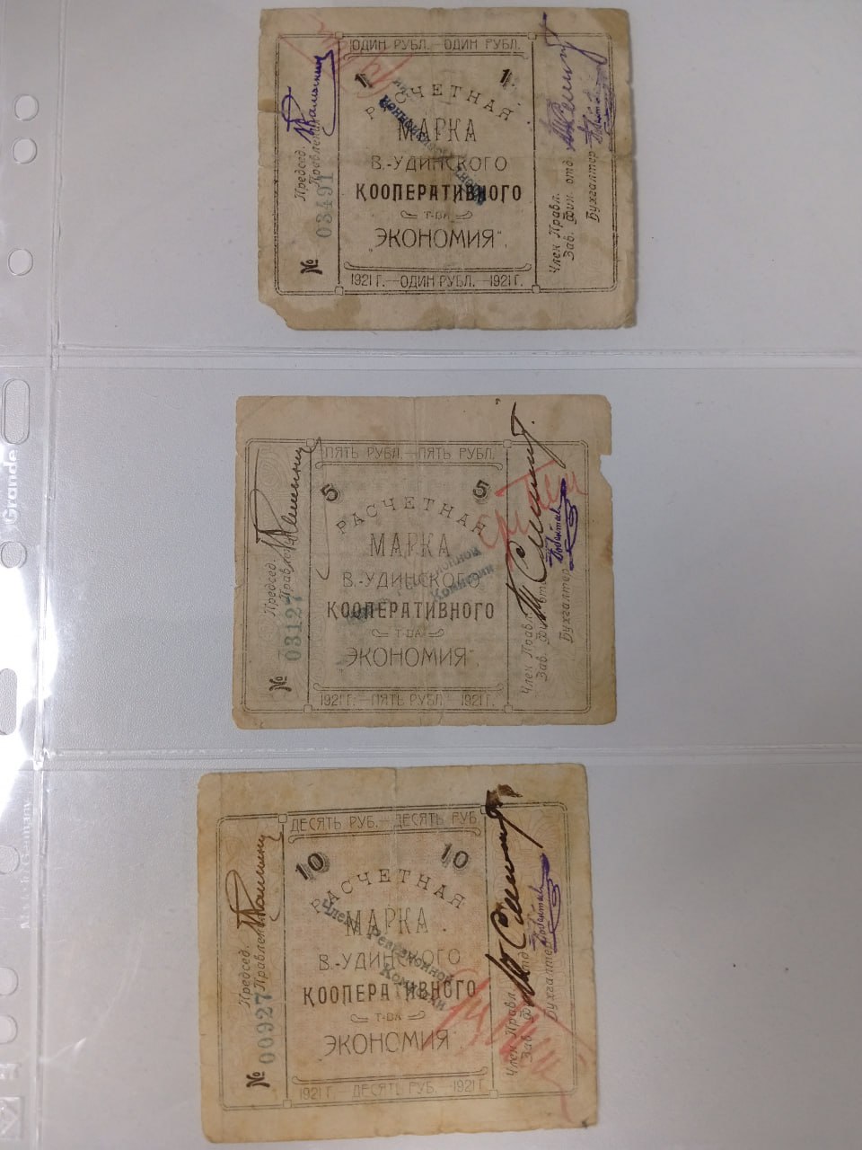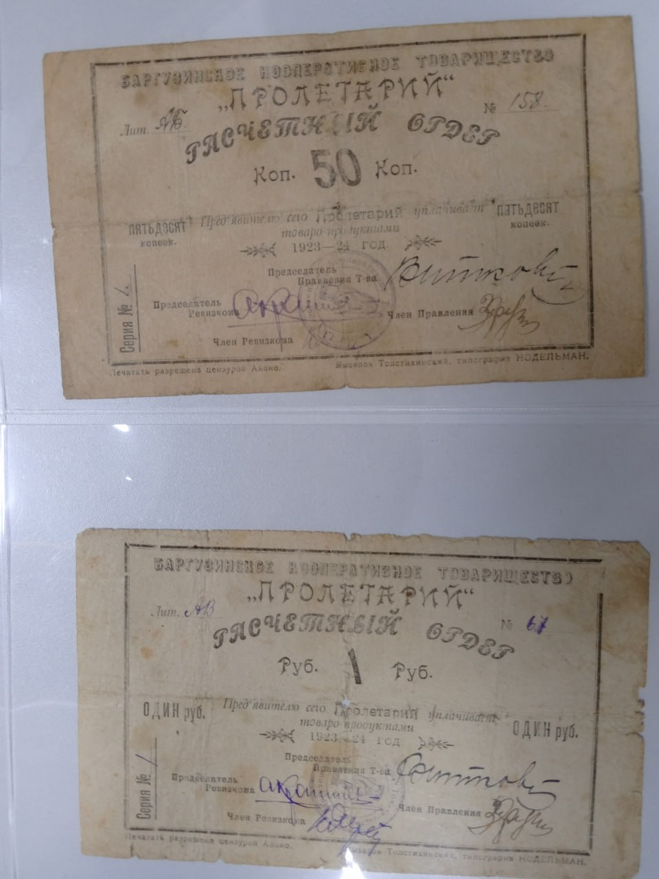 Он показал уникальные купюры - «керенки», которые использовались в Троицкосавске. «Керенки» выпускались листами. В связи с нехваткой мелких денежных знаков Совет народных комиссаров Троицкосавского уезда принял решение в 1918 г. выпустить в обращение местные денежные знаки Кяхтинского отделения Народного банка образца 1917 г. - «керенки» достоинством 20 и 40 руб. При нехватке разменной валюты, вышли из положения таким образом, что «керенки» разрезались на 4 части, получалось по 10 руб. Печатались они в типографии Лушникова, закреплялись печатью, подписывались денежные знаки комиссаром финансов Малафеевым.