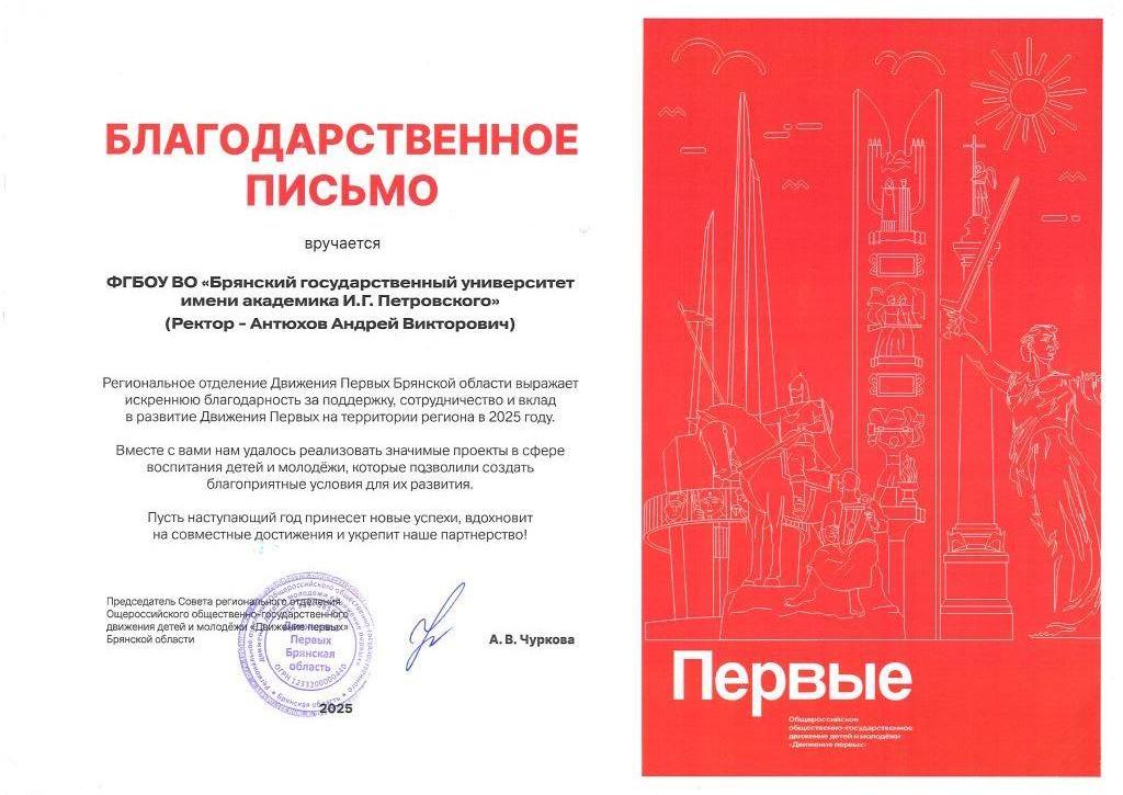 По итогам 2025 года Брянский государственный университет имени И.Г. Петровского был отмечен благодарственным письмом за поддержку, сотрудничество и вклад в развитие Движения Первых на территории региона.
