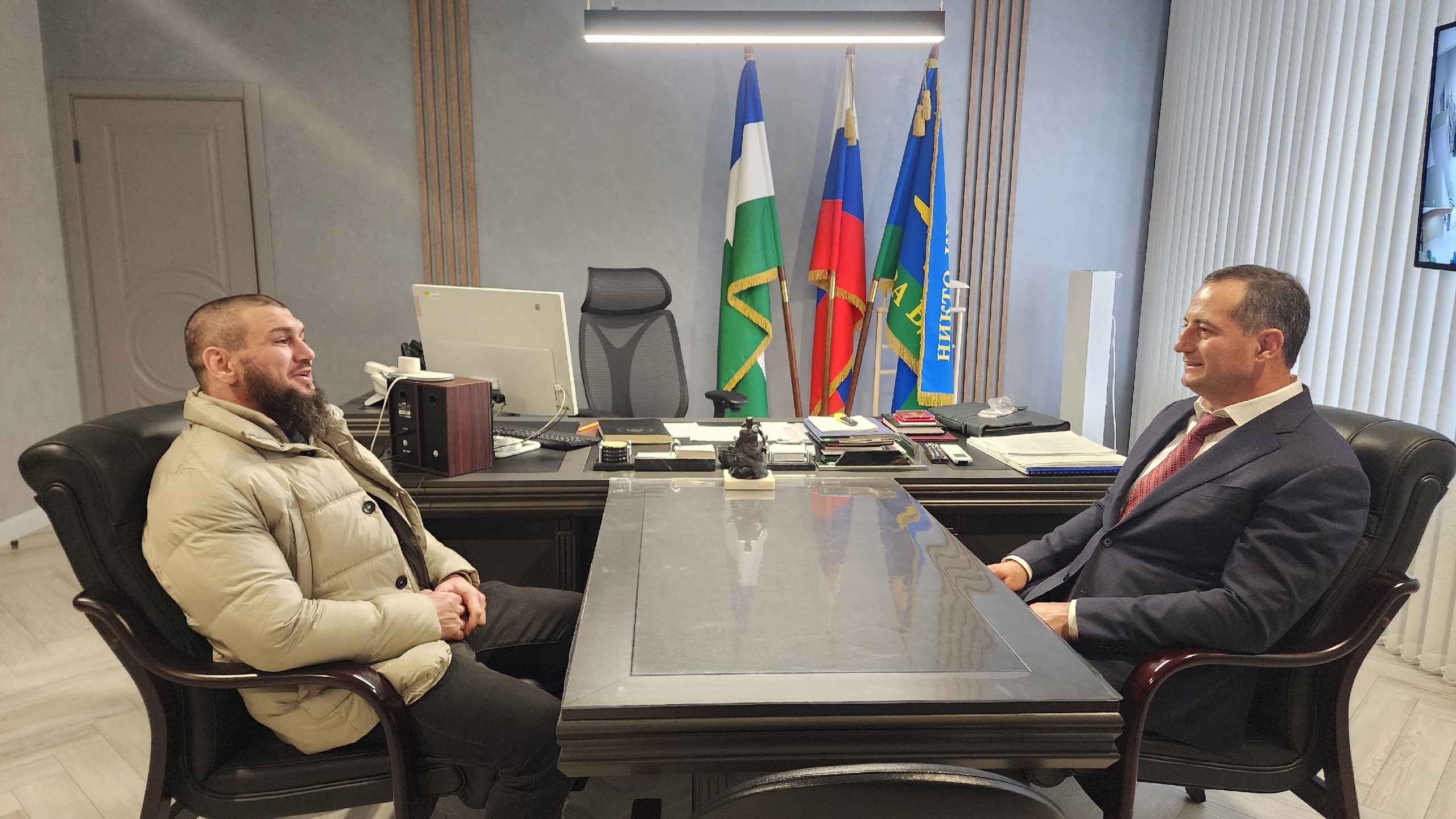 Глава местной администрации городского округа Баксан Хачим Мамхегов провел рабочую встречу с чемпионом мира по джиу-джитсу Али Баговым.