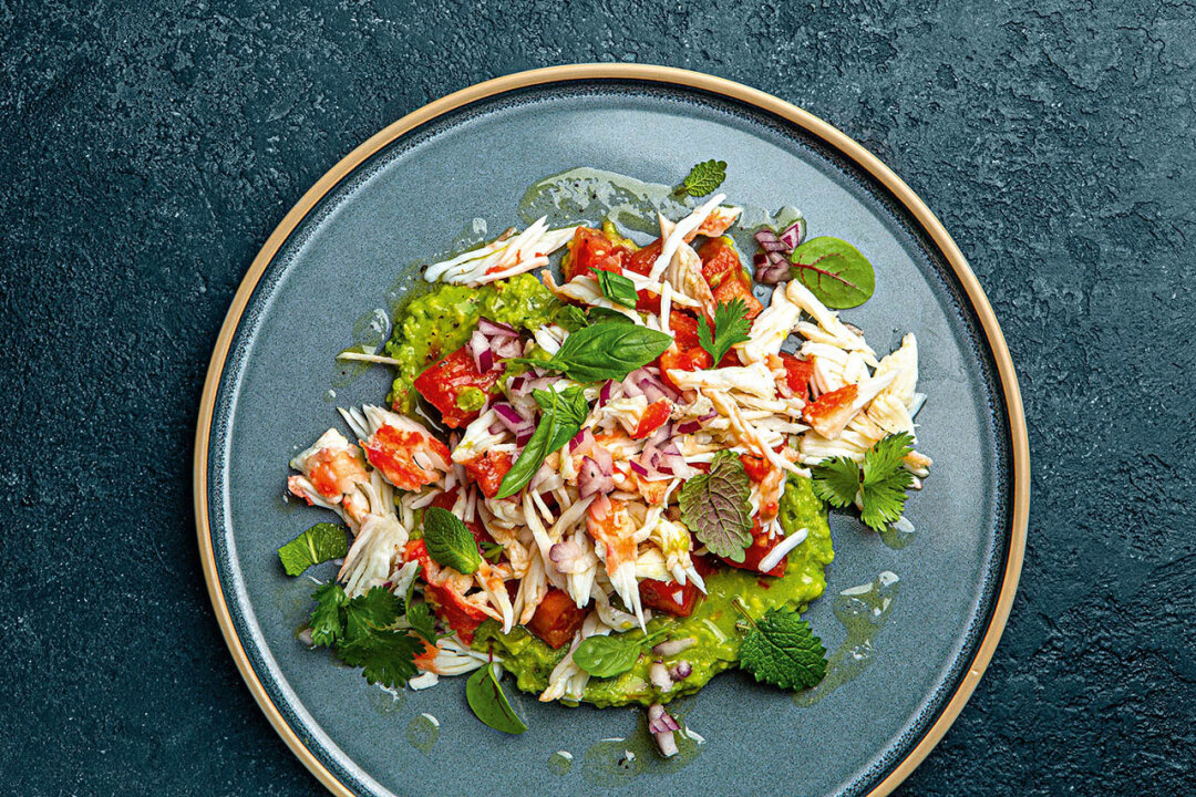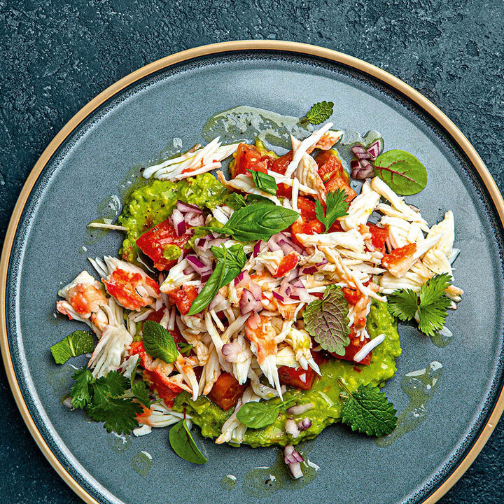 - Соберите салат. Для этого выложите на тарелке мякоть авокадо, на нее помидоры, затем кусочки краба, полейте все соусом цитронет и завершите слоем микса зелени с луком. Полейте по желанию оливковым маслом и посыпьте перцем шичими.