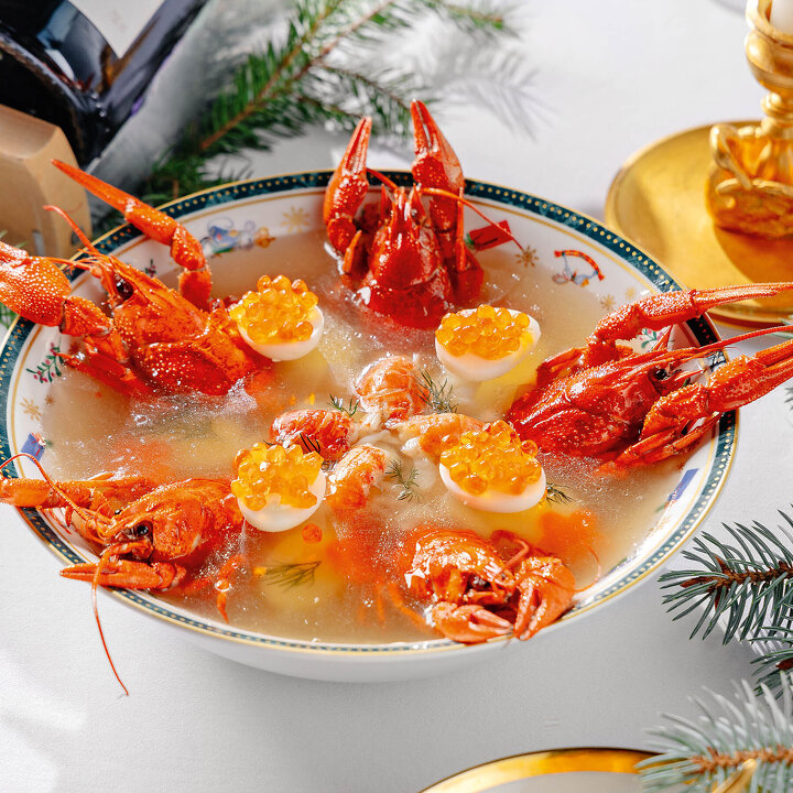 - У раков удалите хвосты и выложите их поровну в двух блюдах так, чтобы голова и клешни выглядывали за кромку тарелки.
