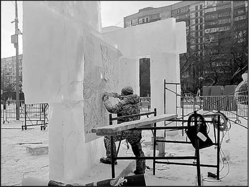 — Монтажом ледовых городков мы занимаемся уже порядка десяти лет, — рассказал скульптор Виктор Белюков, — но в Тюмень приехали впервые. Сейчас работаем над этническими скульптурами богатырей — это достаточно композиционно сложная работа. Для того, чтобы ее выполнить, должны потрудиться художники, дизайнеры, скульпторы. Сначала на бумаге делается рисунок или чертеж, затем из ледяных блоков формируется основной объем скульптуры. После этого резчики обрабатывают массив с помощью стамесок разных форм и размеров, электрических пил, резцов. Чтобы скульптура получилась, резчик должен понимать форму, пропорцию, композицию, — это не такая простая работа. Хотя справляться со льдом гораздо проще, чем с камнем или деревом. Eсли допустил ошибку, что-то лишнее отколол, то всегда можно вырезать и приклеить часть.
