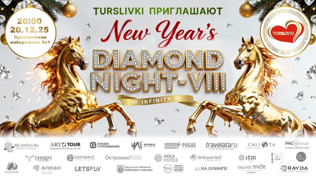 20 декабря 2025 года в ресторане Grand Урюк Berezka (Москва-Сити, башня «Город столиц») состоится заключительное отраслевое событие года — традиционный предновогодний банкет «TURSLIVKI NEW YEAR’S DIAMOND NIGHT — VIII» под концепцией «INFINITY — Восьмое чудо света». Мероприятие объединит 170 представителей туристической индустрии — дилеров, поставщиков, партнёров и участников ассоциации СТА «TURSLIVKI» из России и дружественных стран.