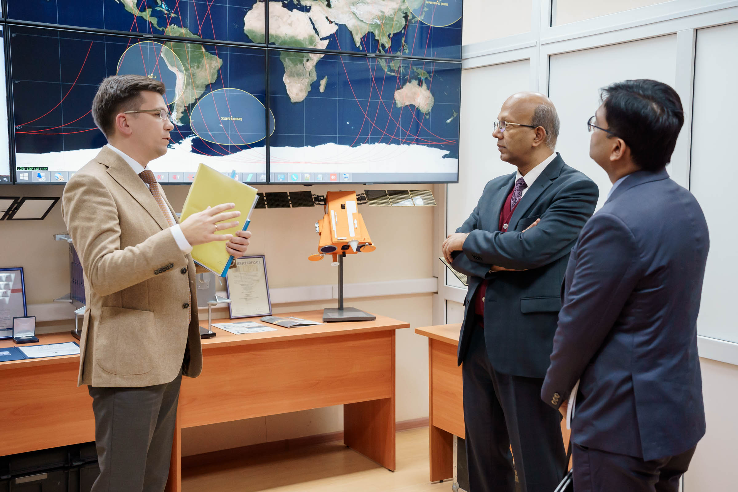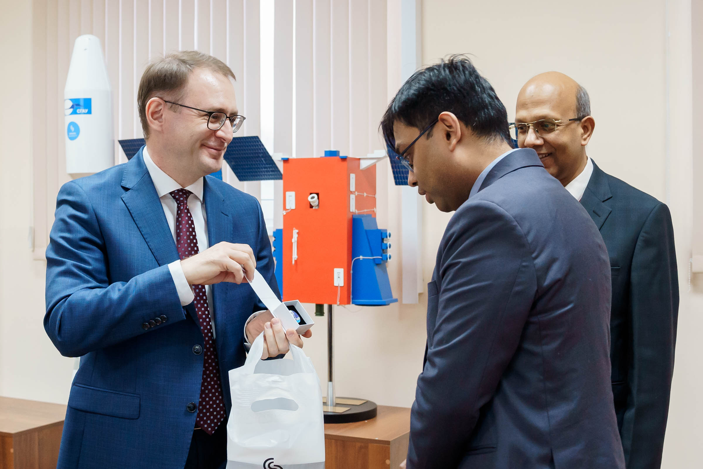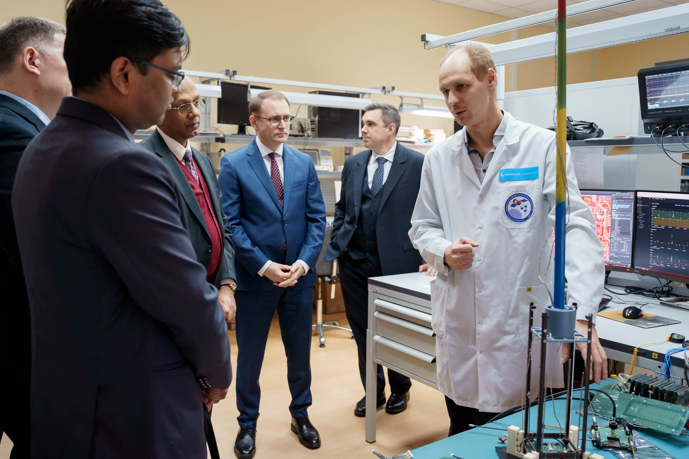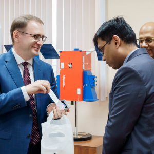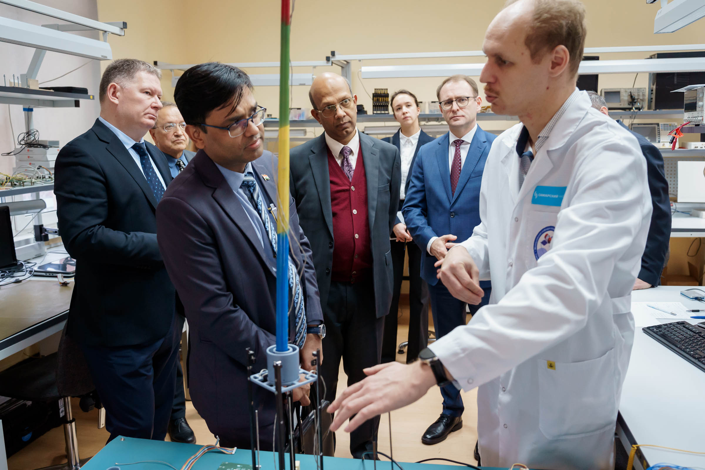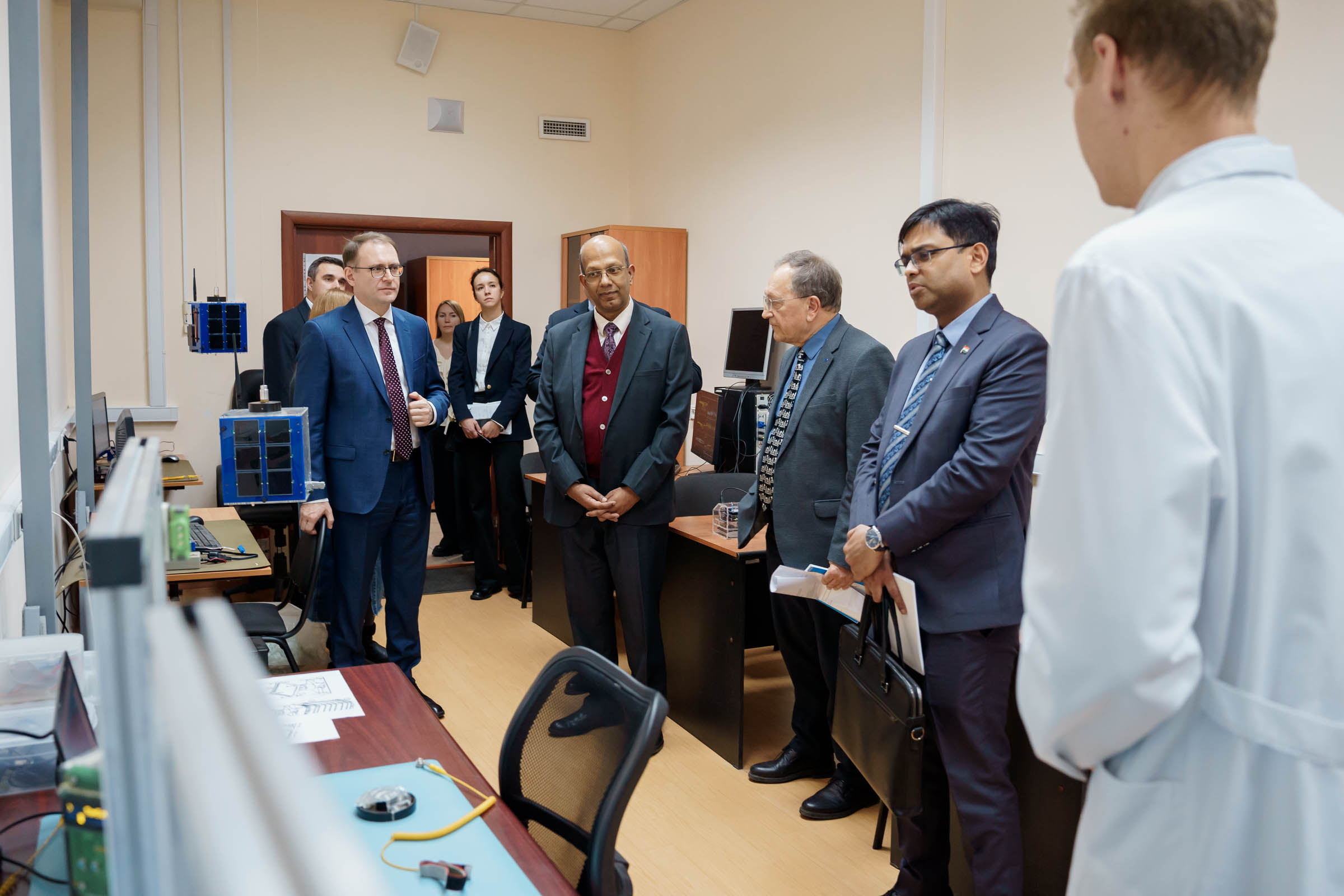 Ректор Владимир Богатырев представил гостям компетенции университета как в аэрокосмической, естественнонаучной, так и гуманитарной сфере. Ряд направлений Винай Кумар и Ануп Кумар Сривастава оценили лично. Они ознакомились с работой межвузовской кафедры космических исследований, сотрудники которой занимаются фундаментальными и прикладными исследованиями в области космического машиностроения, а также оценили центр наноспутниковых технологий – здесь создаются малые космические аппараты. Посетили представители посольства университетские Центр испытаний наноспутников и Наземный комплекс управления спутниками и приема информации из космоса. Посол поинтересовался, какие аппараты готовятся к запуску на орбиту. Иван Ткаченко, директор Института авиационной и ракетно-космической техники университета, пояснил, что к пусковой кампании готовится первый в России радиолокационный спутник формата CubeSat 16U "АИСТ-СТ", созданный совместно со специалистами компании "Специальный технологический центр" из Санкт-Петербурга.