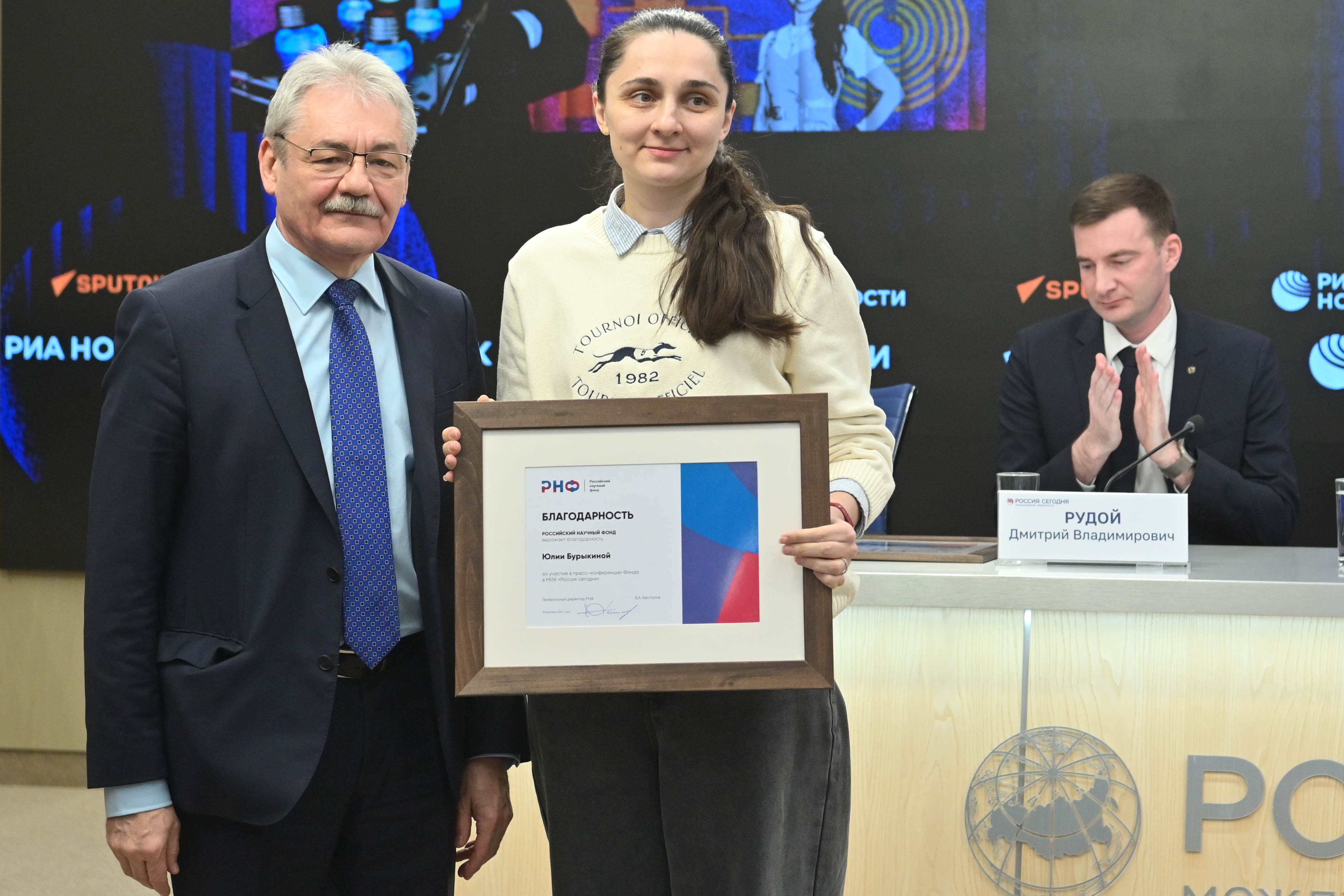 Вчера, на пресс-конференции в рамках совместного проекта МИА «Россия сегодня» и Российского научного фонда,Юлия Бурыкина была отмечена благодарностью, которую вручил генеральный директор РНФ Владимир Беспалов.