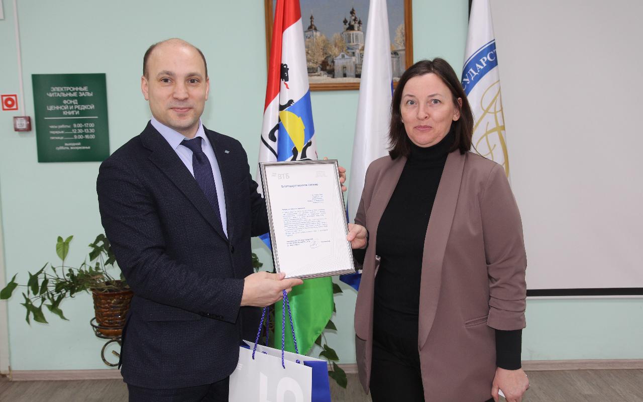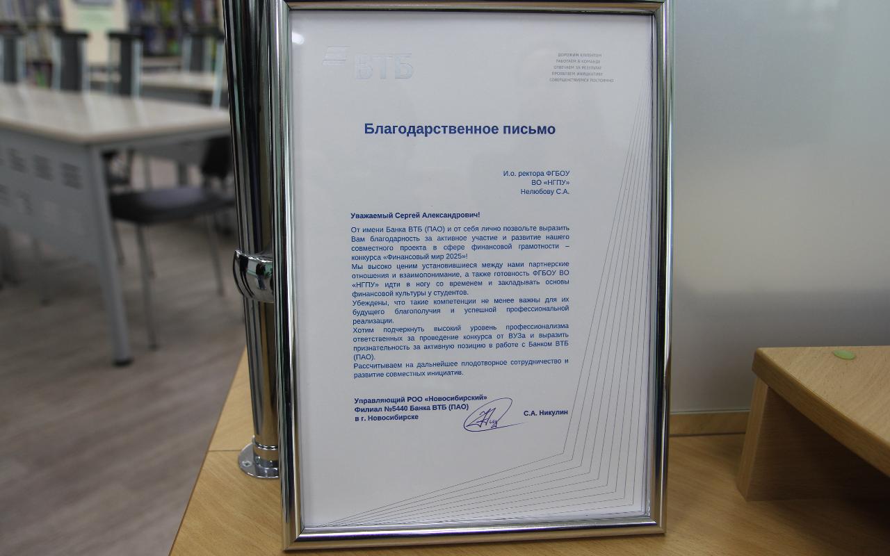 Благодарственные письма от управляющего операционным офисом РОО «Новосибирский» Филиала № 5440 Банка ВТБ (ПАО) Сергея Анатольевича Никулина за активное участие и развитие конкурса «Финансовый мир» получили и.о. ректора НГПУ Сергей Александрович Нелюбов и бухгалтер первичной профсоюзной организации студентов НГПУ Общероссийского Профсоюза образования Светлана Сергеевна Абрамайтис.