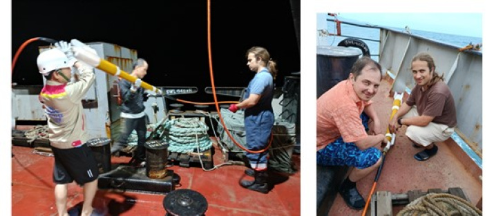 Спуск геологического колонкового пробоотборника гравитационного типа совместным отрядом (производство ТОИ ДВО РАН)