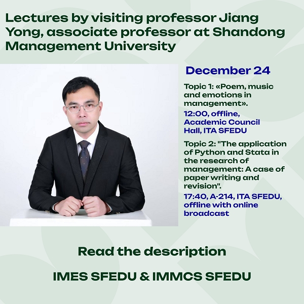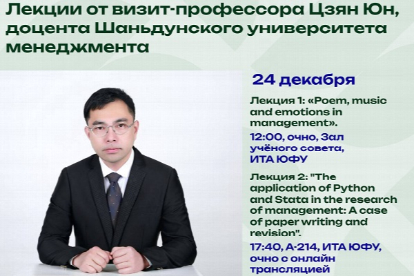 24 декабря в Южном федеральном университете состоятся две открытые лекции от Цзян Юн, сотрудника Шаньдунского университета управления (Китай) и визит-профессора Института управления в экономических, экологических и социальных системах и Института математики, механики и компьютерных наук им. И.И. Воровича Южного федерального университета.
