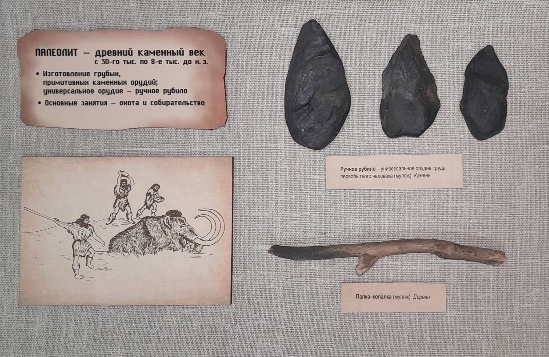 Выставка дополняет интерактивную экспозицию «В пещере первобытного человека», в пространстве которой проводятся занятия для детей по истории древних времен.