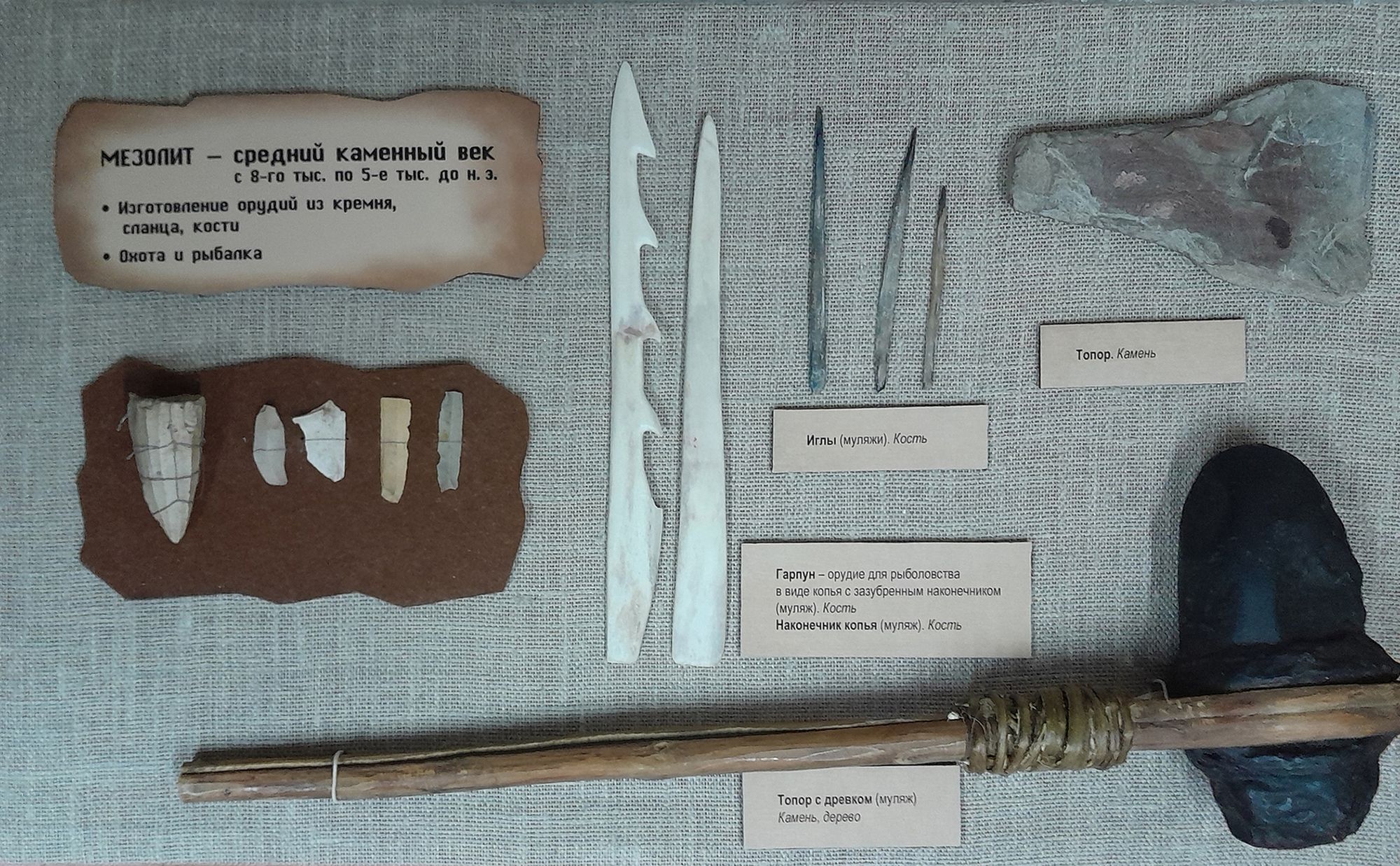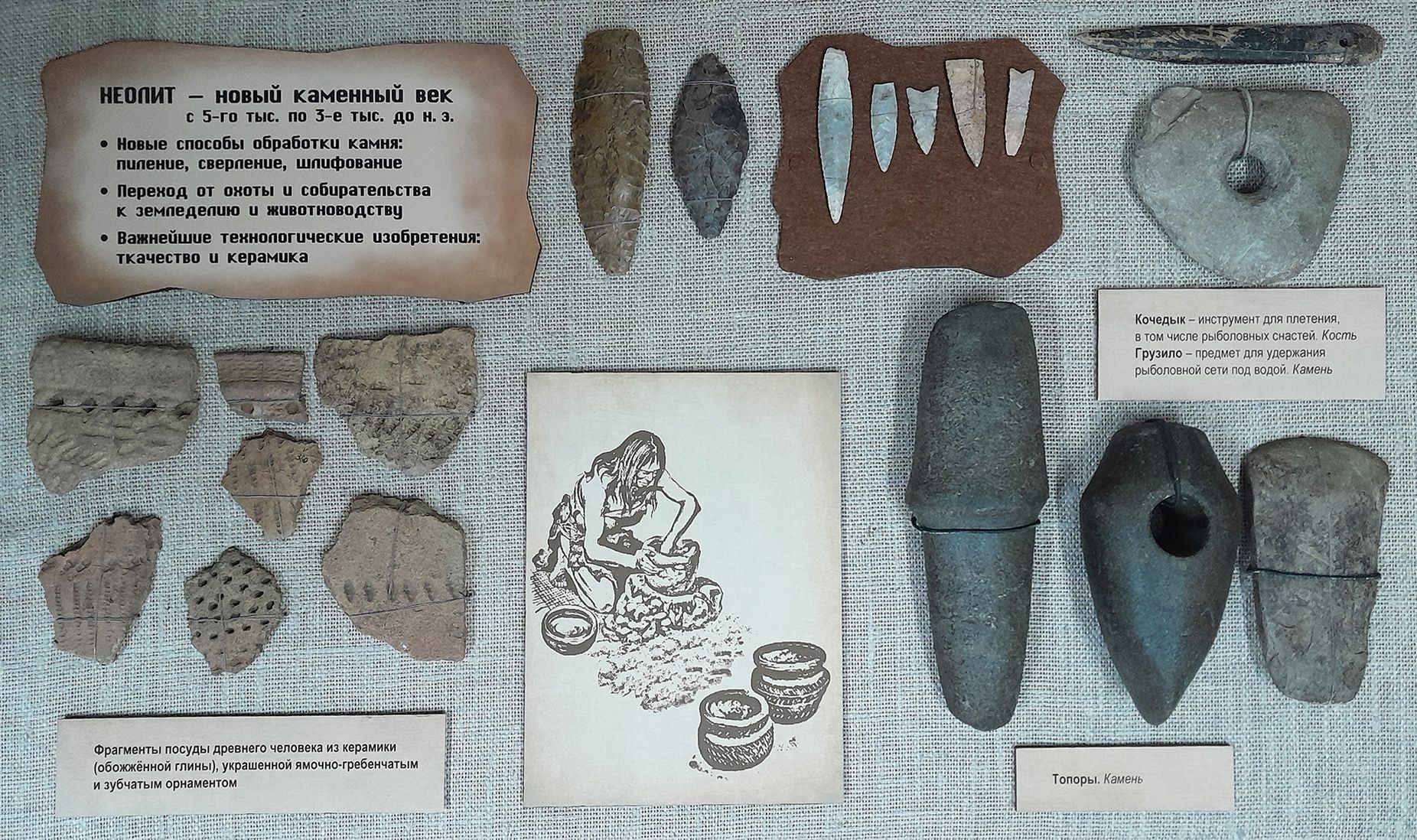 В экспозиции демонстрируются предметы археологии из фондов музея: наконечники стрел и копий, орнаментированные фрагменты керамики, грузило, топоры эпохи каменного века, костяной кочедык для плетения сетей.