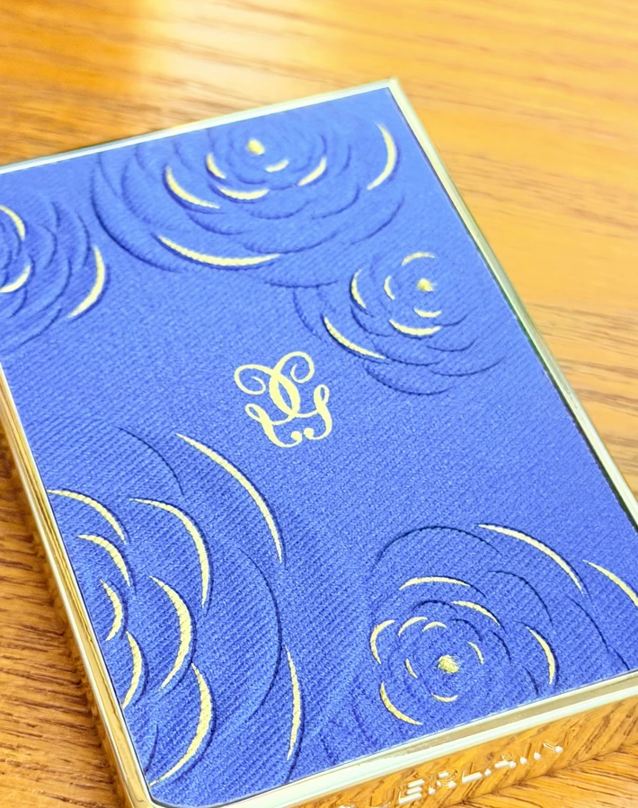 Футляр из лимитированной серии украшен цветочным узором, детали лепестков выполнены с использованием золотой фольги, а тычинки — вышивка, что демонстрирует высочайшее мастерство исполнения.