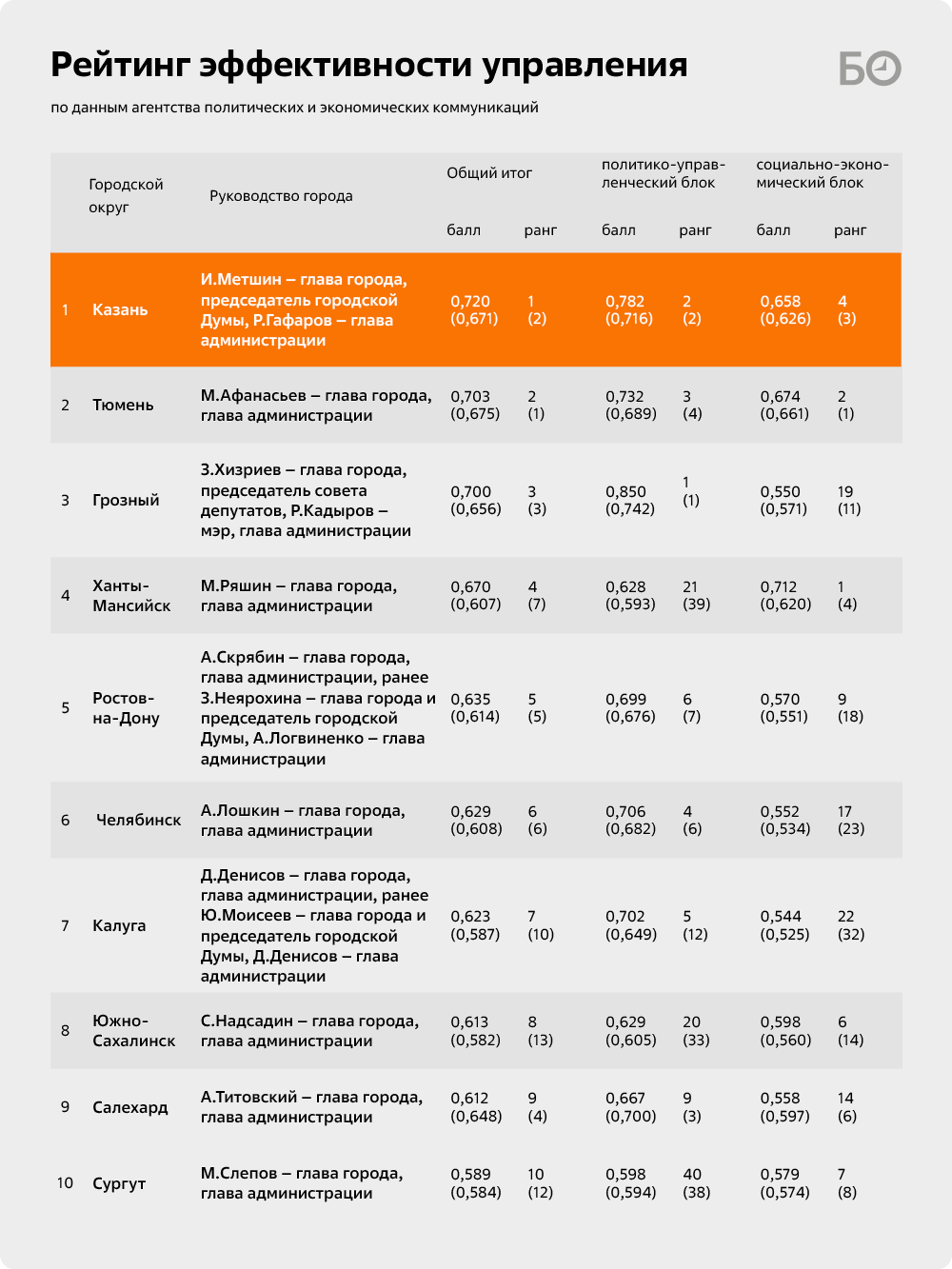 Так, агентство политических и экономических коммуникаций (АПЭК) Дмитрия Орловапредставило 9-й рейтинг эффективности управления в городских округах России. В мотивировочной части исследования авторы подчеркивают ключевую роль муниципальной реформы. В то же время лидером рейтинга по итогам 2025 года стала Казань, сместившая Тюмень на 2-ю позицию. Т. е. 1-е место занял город, где переход к одноуровневой модели местного самоуправления фактически не осуществлялся и по-прежнему сохраняется разделение полномочий между главой города и главой администрации.