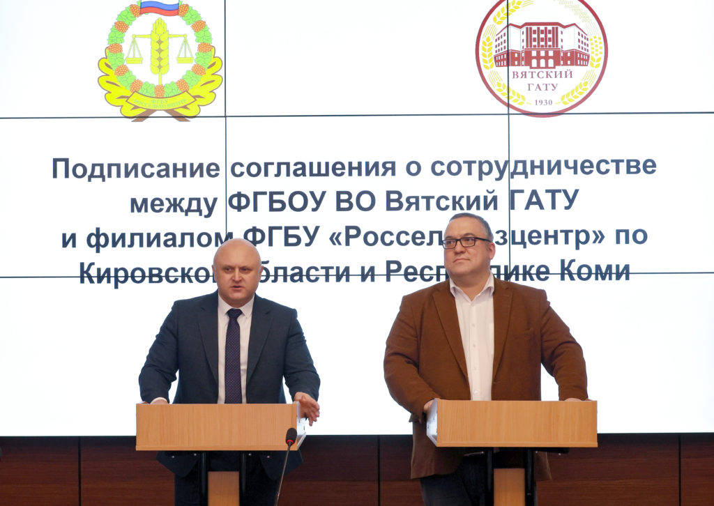 Очередное заседание ученого совета университета началось с подписания соглашения о сотрудничестве между ФГБОУ ВО Вятский ГАТУ и филиалом ФГБУ «Россельхозцентр» по Кировской области и Республике Коми.