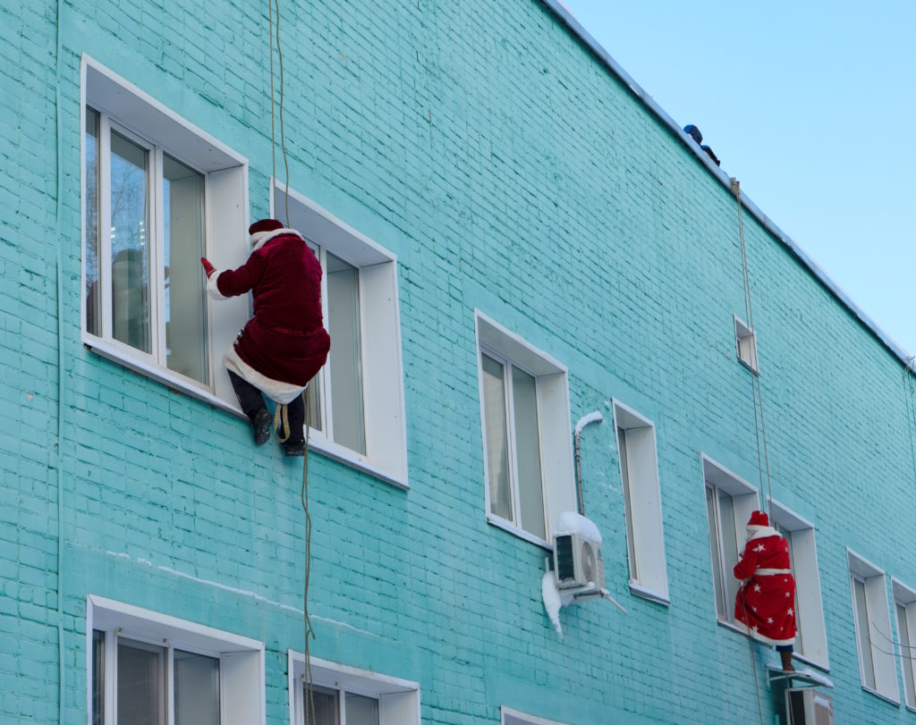 Два добровольца в новогодних костюмах с помощью альпинистского снаряжения спустились с крыши, чтобы удивить и порадовать ребят.