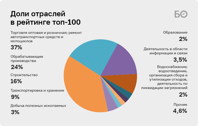 В разрезе основного вида деятельности исследуемые компании генерируют обороты абсолютно в других областях, нежели предприятия из топ-300. Если в основном рейтинге балом правит добыча полезных ископаемых и обрабатывающие производства, то в данном — торговля. Доля организаций, занятых в оптовой и розничной торговле, составляет 37%. Фирмы, занятые в обрабатывающем производстве, занимают 18%, 16% приходится на строительные компании, а 9% — на транспортные.
