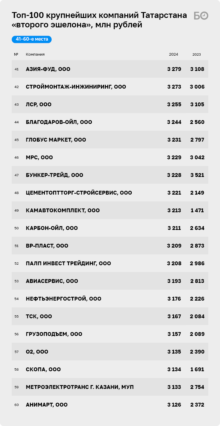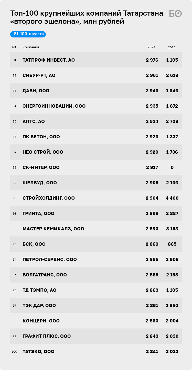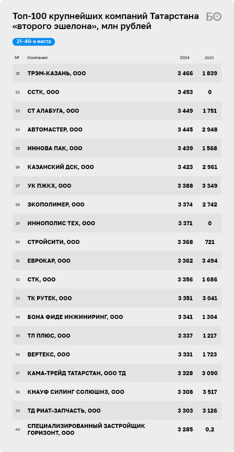 16 лет «БИЗНЕС Online» анализирует и рейтингует татарстанский бизнес, который, несмотря на экономические трудности, не только прирос доходами, но и пополнился новыми именами. Наш основной топ-300 уже не в состоянии вместить все успешные компании, обороты которых показывают ежегодный рост. В новую табель о рангах вошли 100 бизнес-единиц, не дотянувших до нижней границы топ-300, которая, напомним, поднялась в 2025-м почти до 3,7 млрд рублей. Стоит отметить, что 21 компания из данного списка в прошлом году засветилась в основном топ-300, но, за счет того что они в 2024-м отработали менее успешно, в этом году они довольствуются участием в рейтинге компаний второго эшелона. И это несмотря на то, что их суммарная выручка сократилась незначительно — всего на 5 млрд рублей — с 76 млрд в 2023-м до 70 млрд рублей в 2024-м.