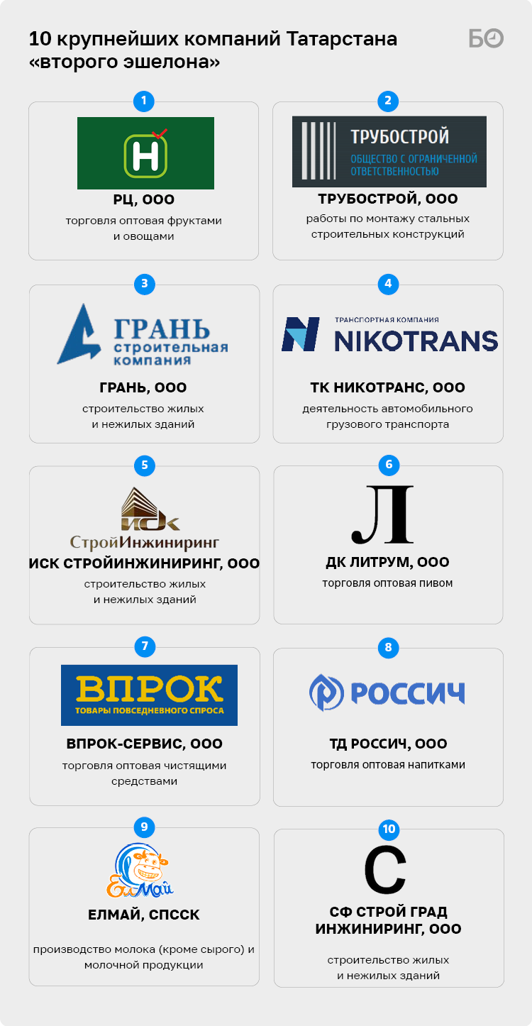 На 93-м месте компания «Булгарстройкомплект» (93), которая, несмотря на свое название, была прописана сначала в Альметьевском районе, а теперь — в Кукморском. Владельцами фирмы значатся ООО «РСТК» (99%) и ООО «Фабрик-а». Ключевая фигура — Нияз Аитов, формальный владелец РСТК. С сентября прошлого года Аитов стал депутатом Госсовета Татарстана от «Единой России» и был включен в профильный комитет по жилищной политике и инфраструктурному развитию, а также является членом депутатской группы «ТНВ» в Госсовете.