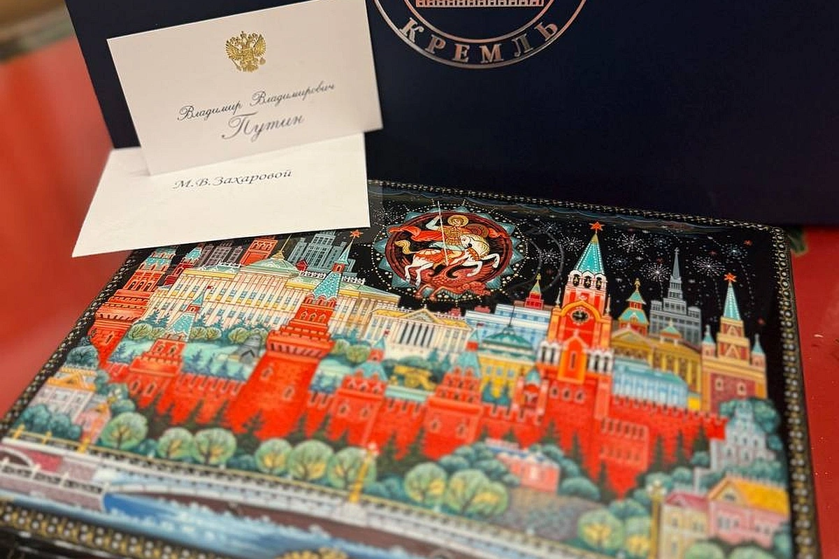 Этот подарок Мария Захарова представила в своем Telegram-канале. На крышке шкатулки изображен вид Кремля и Георгий Победоносец, есть надписи — Москва и Кремль.