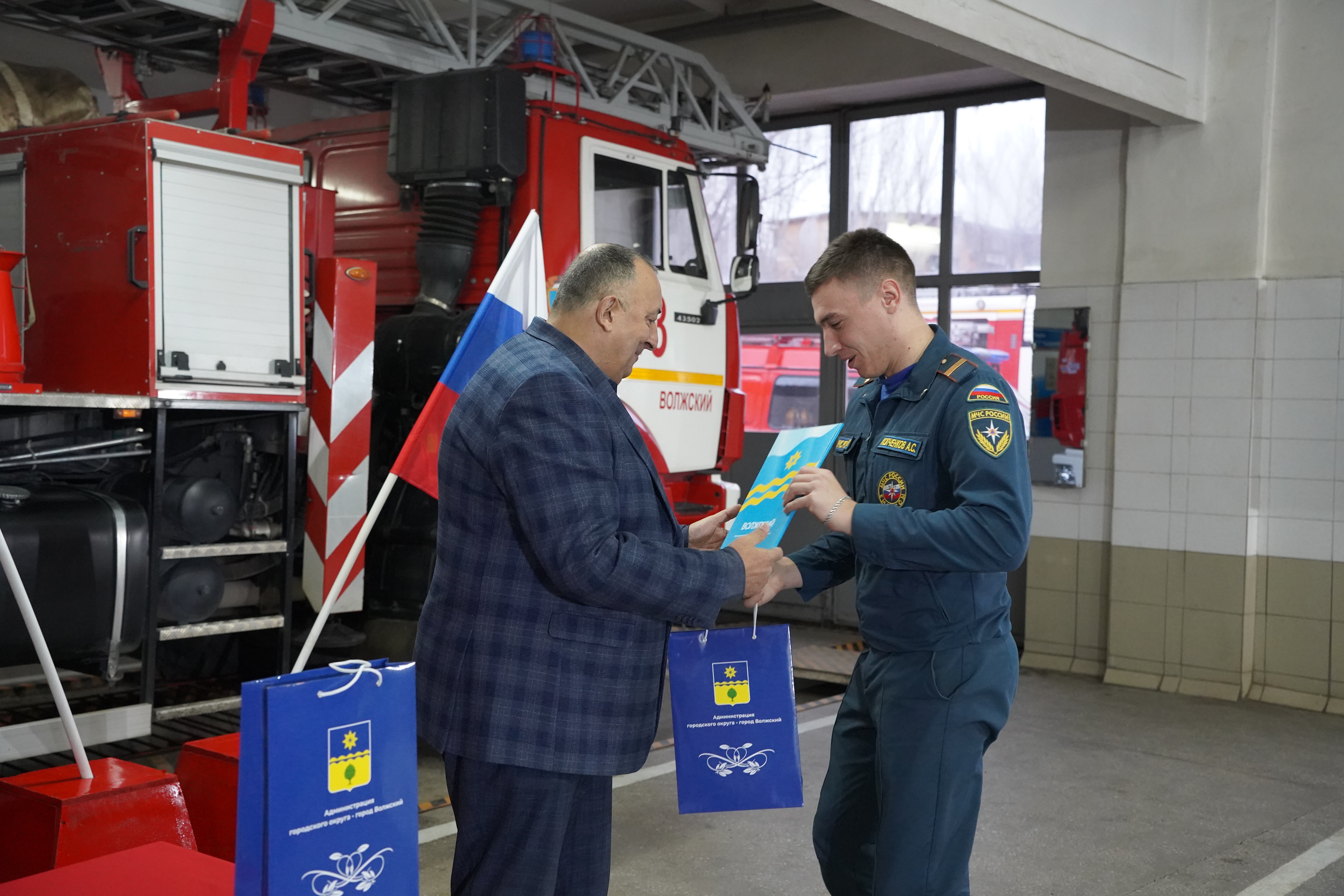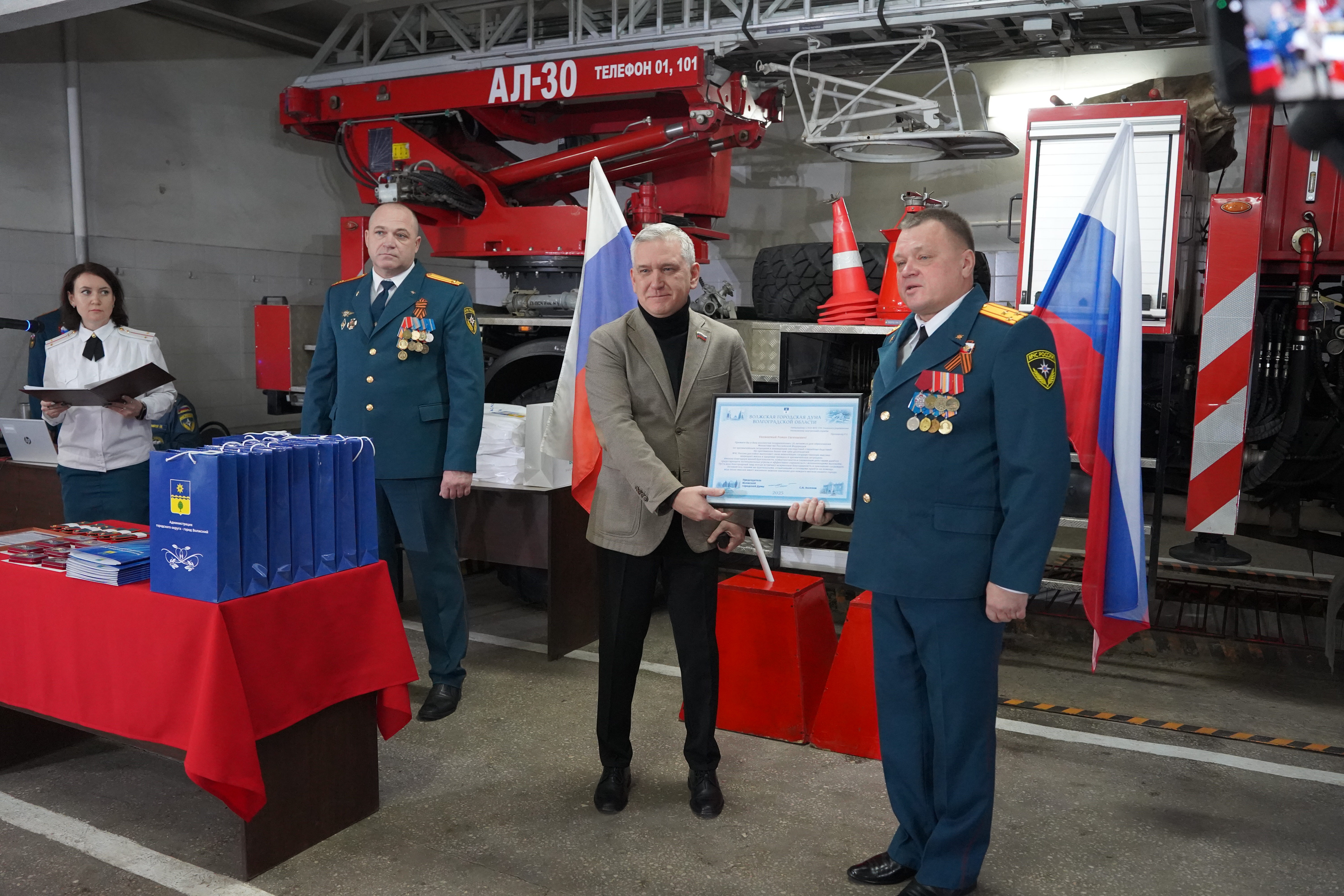 Юрий Жучков вручил благодарности главы города Волжского Игоря Воронина пяти сотрудникам 5-го пожарно-спасательного отряда.