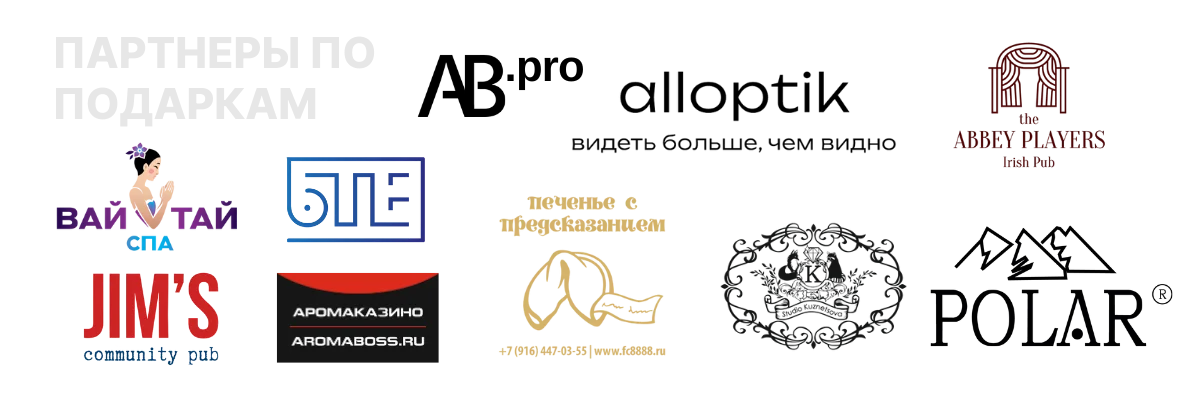 Среди партнеров по подаркам: Polar, игра AROMABOSS, Studio Kuznetsova, «Корпорация удачи», магазин оптики ALL OPTIK, сеть салонов тайского массажа «Вай Тай», компания БТЕ-системный интегратор, партнер по финансовому росту Анна Баранова, паб-театр Abbey и комьюнити-паб Jim’s.
