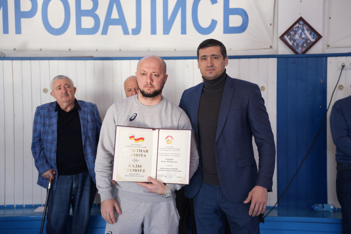 Президент федерации самбо Северной Осетии Таймураз Фидаров поприветствовал участников и гостей турнира и вручил Почетные грамоты правительства республики Феликсу Тедееву и Батрадзу Кодзаеву.