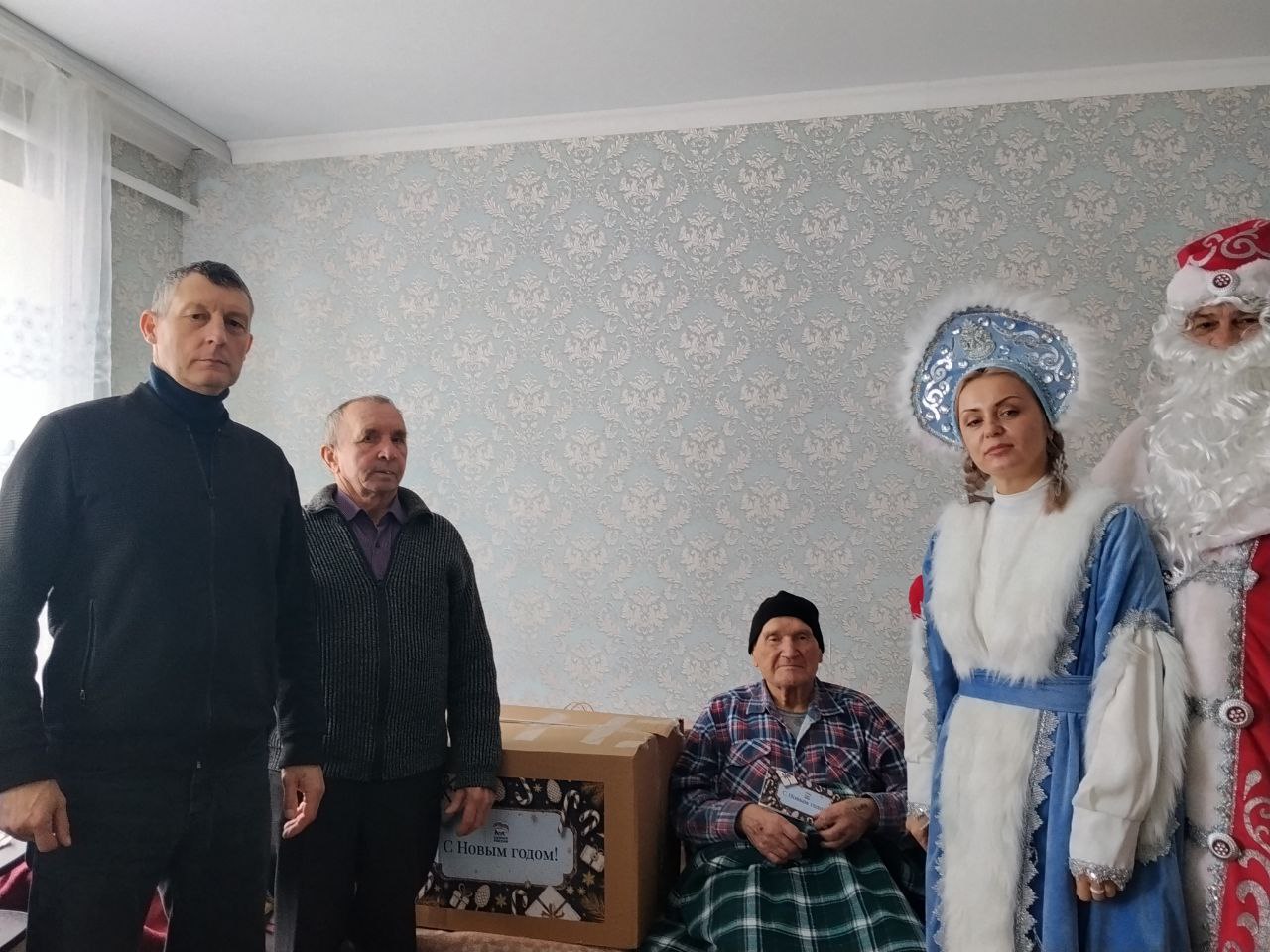 Исполнительный секретарь местного отделения «Единой России», депутат Ставропольской гордумы Алексей Зимин и участник СВО Владимир Лысенко поздравили на дому Дмитрия Назаровича Скоробогача и вручили новогодний подарок.