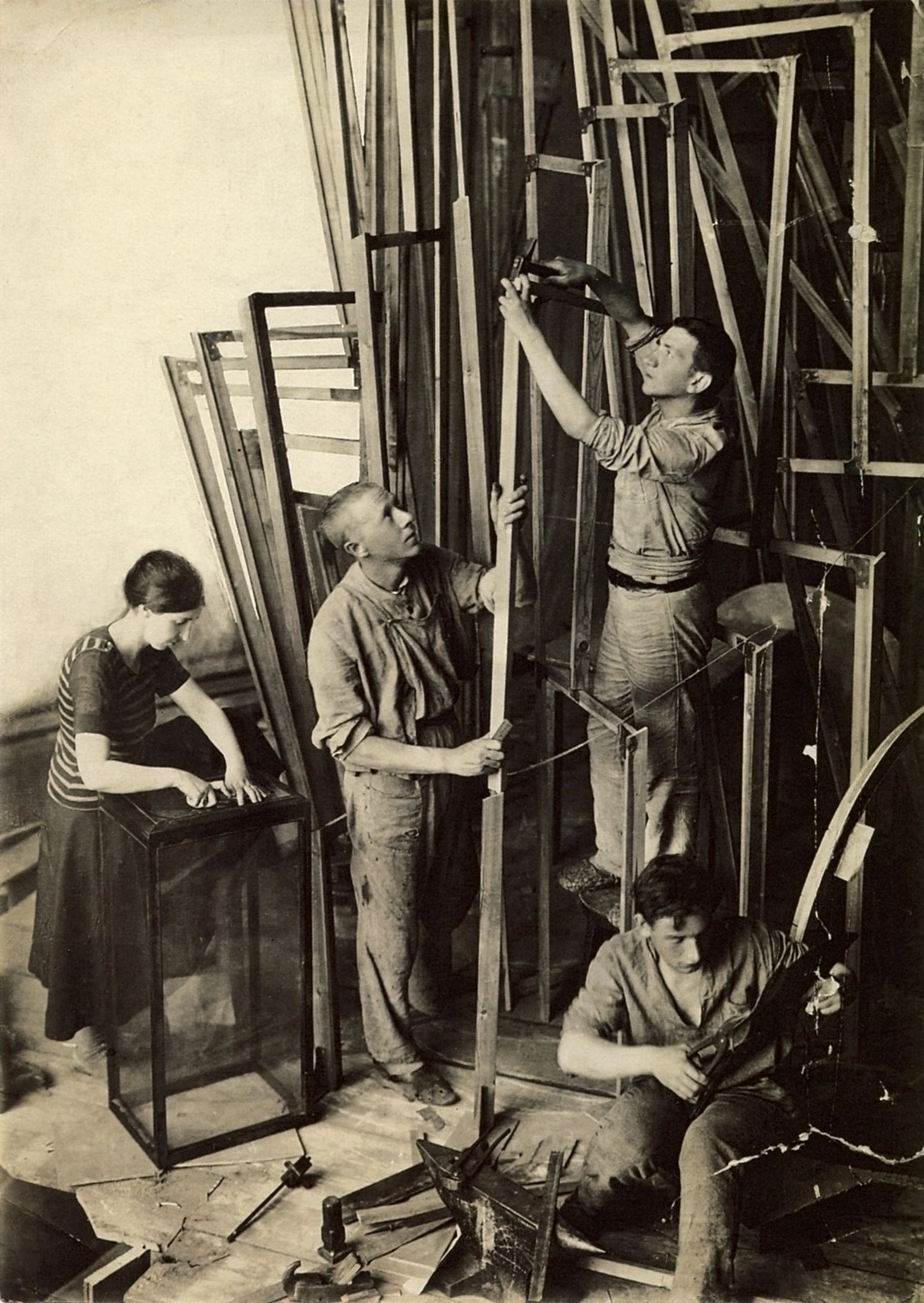 Владимир Татлин (стоит в центре) с ассистентами работает над макетом башни. 1920 Фото: commons.wikimedia.org