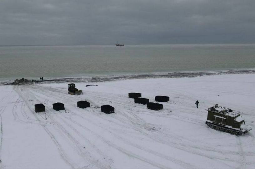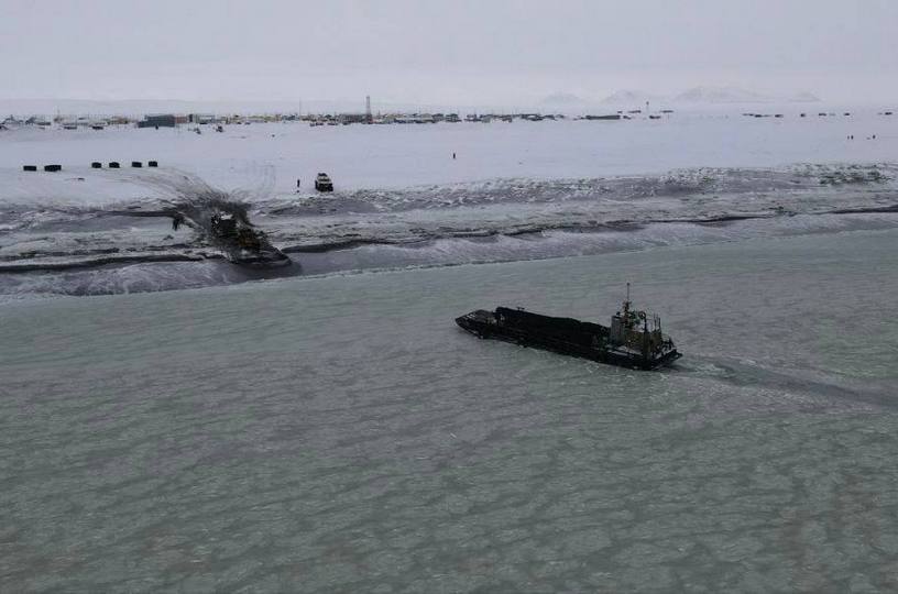 Выгрузка угля у Мейныпильгыно началась 26 декабря. С теплохода "Мария" на берег баржей доставили бульдозер. С помощью тяжёлой техники идёт выгрузка на необорудованный берег – бульдозер стягивает с баржи волокуши с топливом. Источник: https://prochukotku.ru/news/transport/bolee_800_tonn_uglya_vygruzili_v_sele_meynypilgyno_s_teplokhoda_mariya/