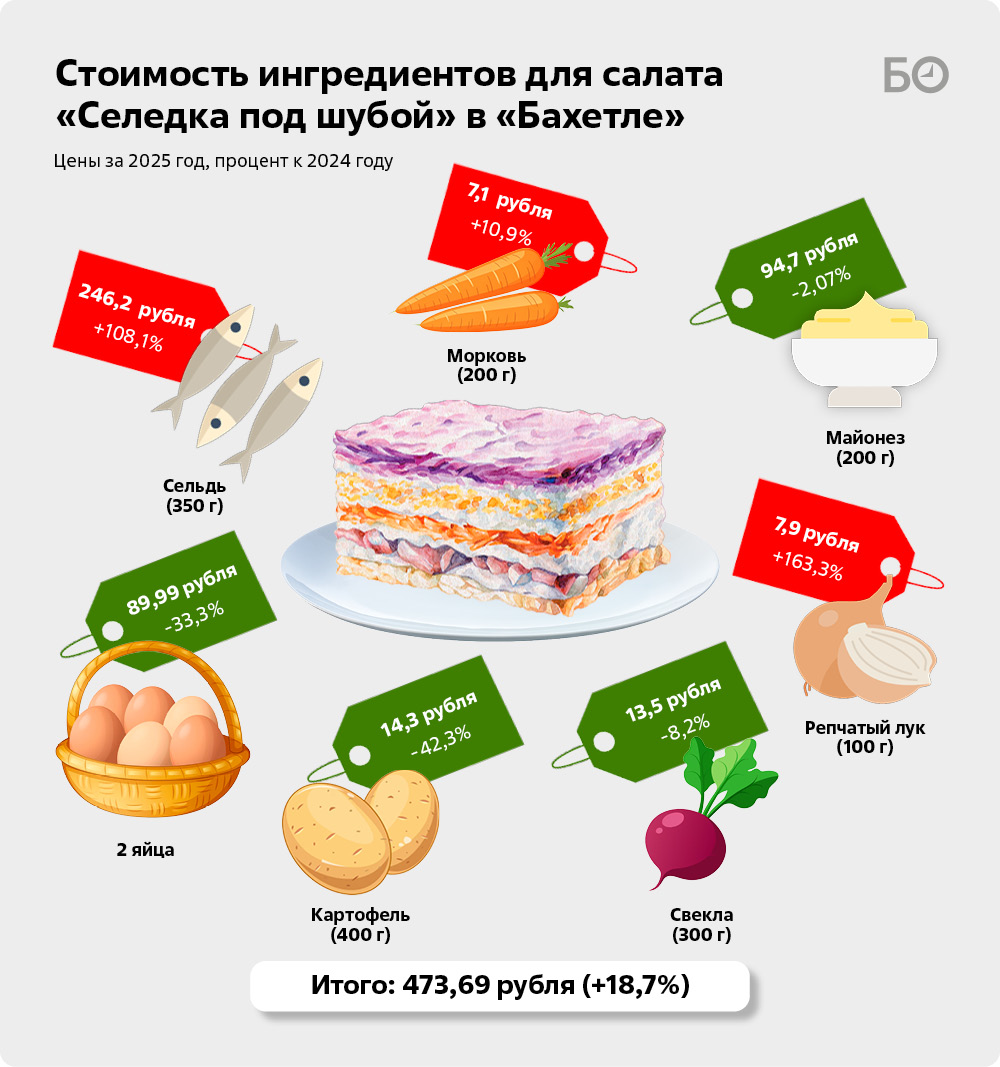 Набор для селедки под шубой в сети Латыповой обойдется почти в 500 рублей, что на 75 рублей дороже, чем в прошлом году. Сказалось подорожание рыбки, моркови и репчатого лука. Разница между среднестатистическими подсчетами весьма внушительная — 62,8%. «Шубу» в «Ашане» можно будет собрать при этом за 350,7 рубля, стоимость ингредиентов выросла на 6,2% по сравнению с 2024-м. Здесь также подорожала сельдь, а еще майонез и свекла. Ингредиенты, купленные у федерального ретейлера, на 20,5% дороже, чем по статистическим данным.