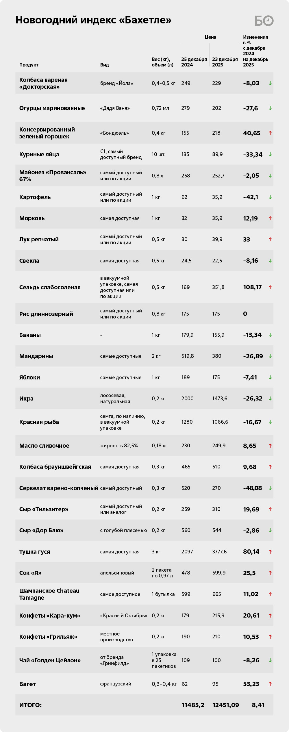 «В конце декабря, по моим ощущениям как потребителя, цены сильно не вырастут по той простой причине, что не ожидается никакого ажиотажного бума в магазинах, какой был в предыдущие годы. Мы много общаемся с коллегами из продуктовой и непродуктовой розницы, и все говорят, что никакого бума продаж нет, все покупки очень аккуратные, осторожные. Даже к концу декабря не ждут толп народу в магазинах, поэтому в такой ситуации поднимать цены — это значит вообще уничтожать продажи и получать огромное количество товаров на складах», — говорил учредитель отраслевого портала «Продукт Медиа», эксперт по ретейлу Михаил Лачугин в начале декабря. И действительно, глядя на продуктовые корзины «Ашана» и «Бахетле», видно, что цены на часть продуктов не то чтобы не выросли, а еще и снизились, однако это не спасло от итогового подорожания. Кратко напомним о методологии расчетов: на нашем воображаемом праздничном столе оливье и селедка под шубой (по рецепту Росстата), гусь с яблоками и рисом, колбасная и сырная нарезки, бутерброды, фрукты, сладости и напитки для семьи из четырех человек, двое из которых дети.