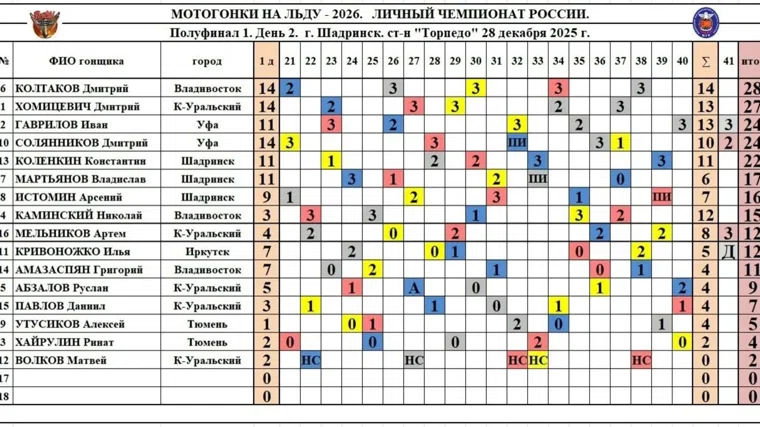 Победу в полуфинале одержал спортсмен из Владивостока Дмитрий Колтаков, опередивший в решающем 34-м заезде Дмитрия Хомицевича. Бронзовую медаль в напряженной борьбе завоевал представитель Уфы Иван Гаврилов. Все три гонщика шадринской команды «Торпедо-ШААЗ имени Н.Красникова» — Константин Коленкин, Владислав Мартьянов и Арсений Истомин — уверенно преодолели полуфинальный барьер, заняв места с пятого по седьмое, и теперь готовятся к борьбе за главный титул страны.