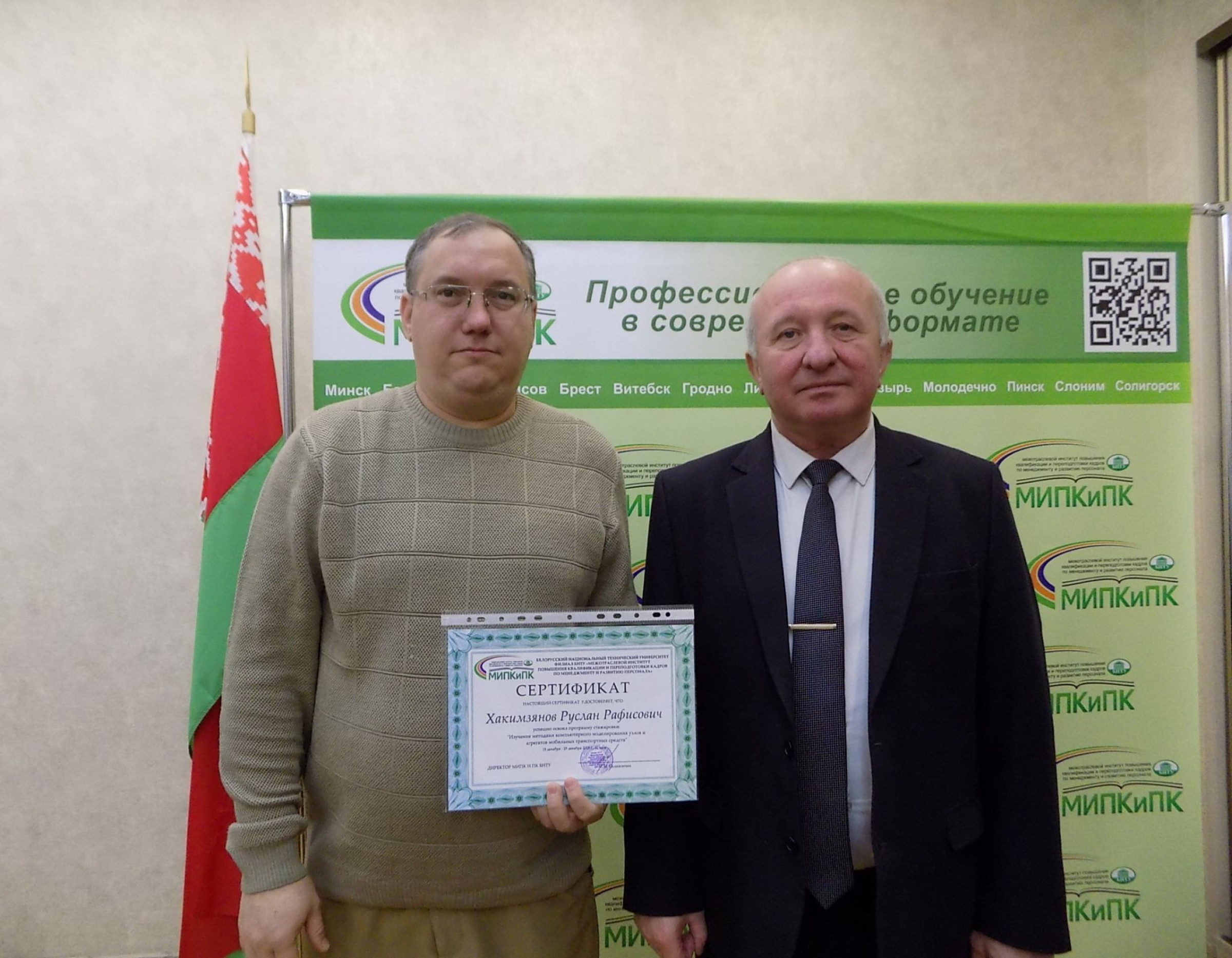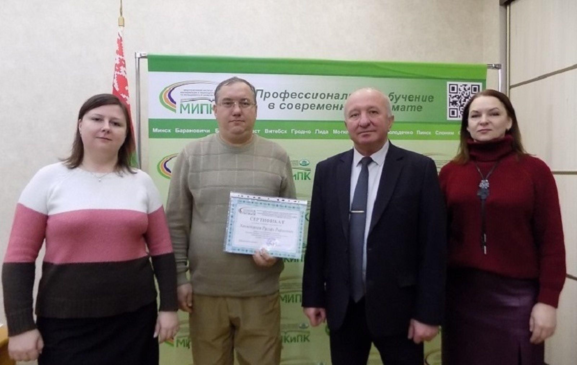 РусланХакимзяновуспешно завершил образовательную программу, прошел итоговую аттестацию и получил именной сертификат, который вручил директор МИПК и ПК БНТУНиколай Селивончик.