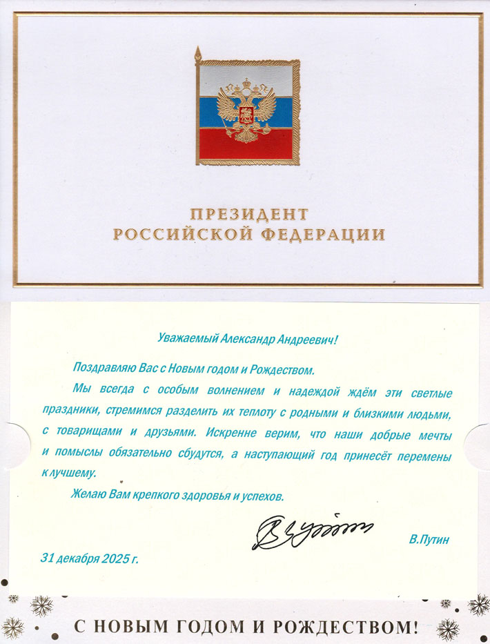 Президент Российской Федерации Владимир Путин поздравил Председателя Общественной палаты Республики Крым Александра Форманчука с Новым, 2026 годом и Рождеством Христовым.