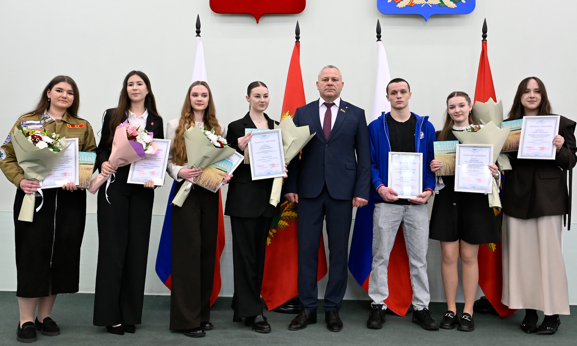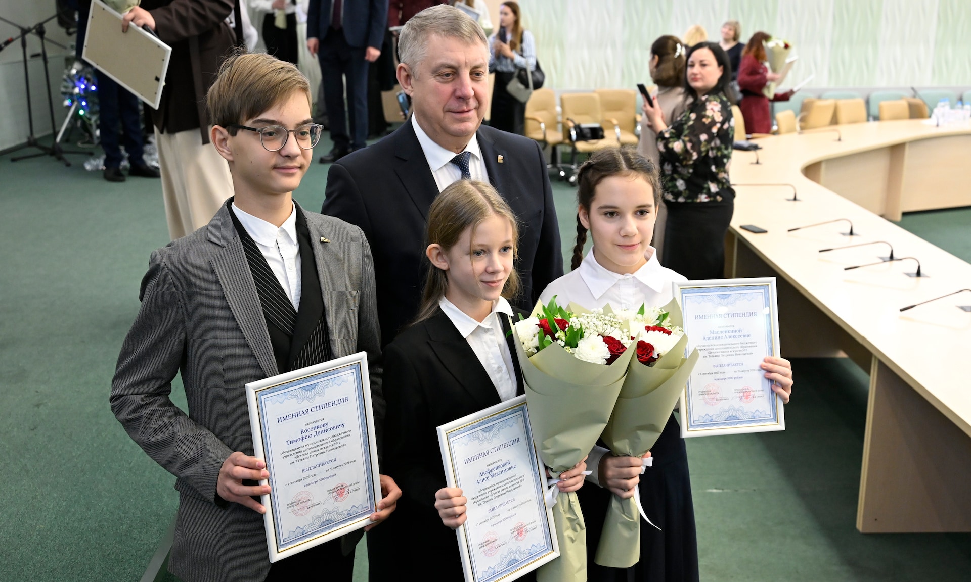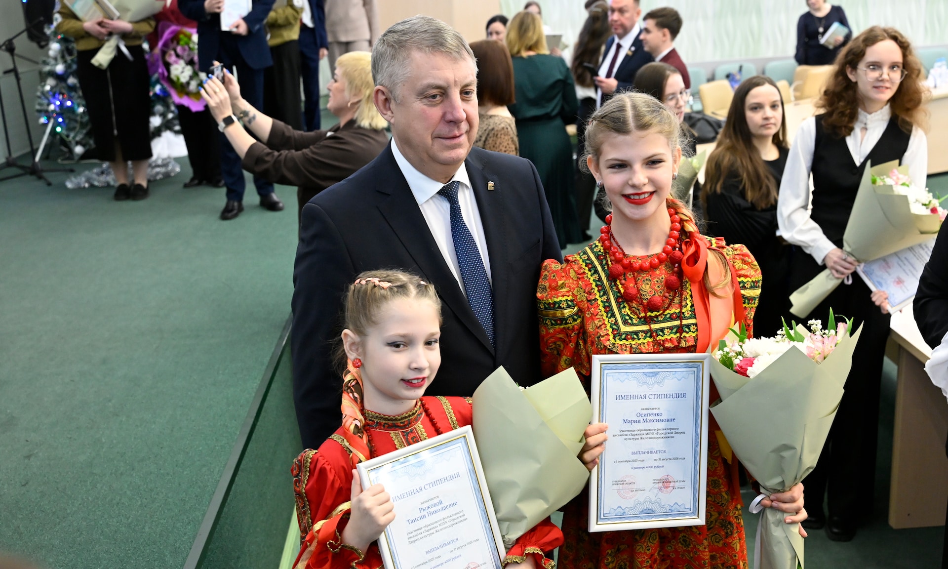 — От себя лично и от имени депутатов Брянской областной Думы рад приветствовать в этом зале одарённых ребят — именных стипендиатов — тех, кто прославляет наш край, служит настоящим примером.